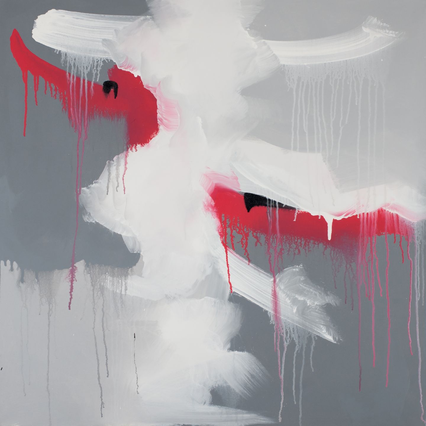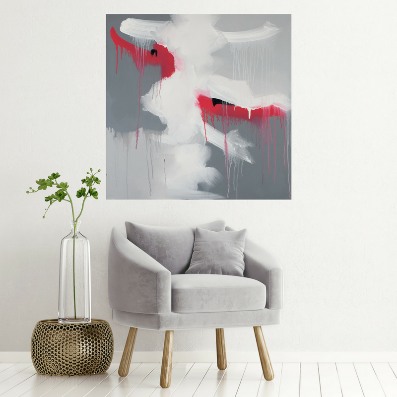 Beautiful grey abstract drip painting featuring black, white and a touch of red.