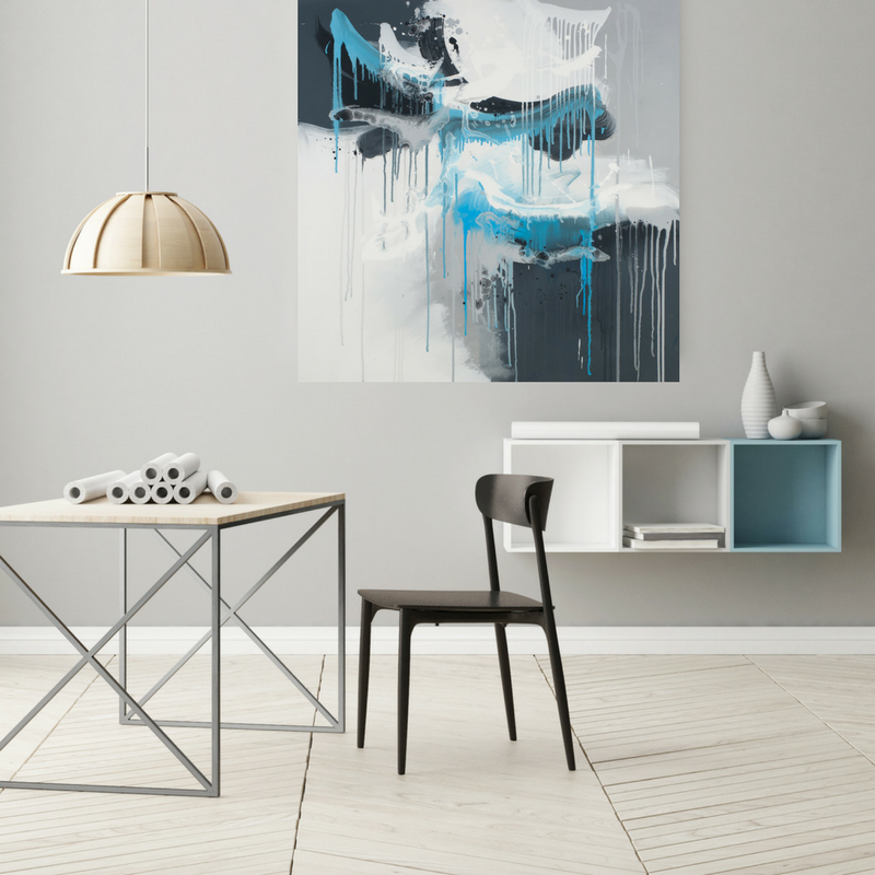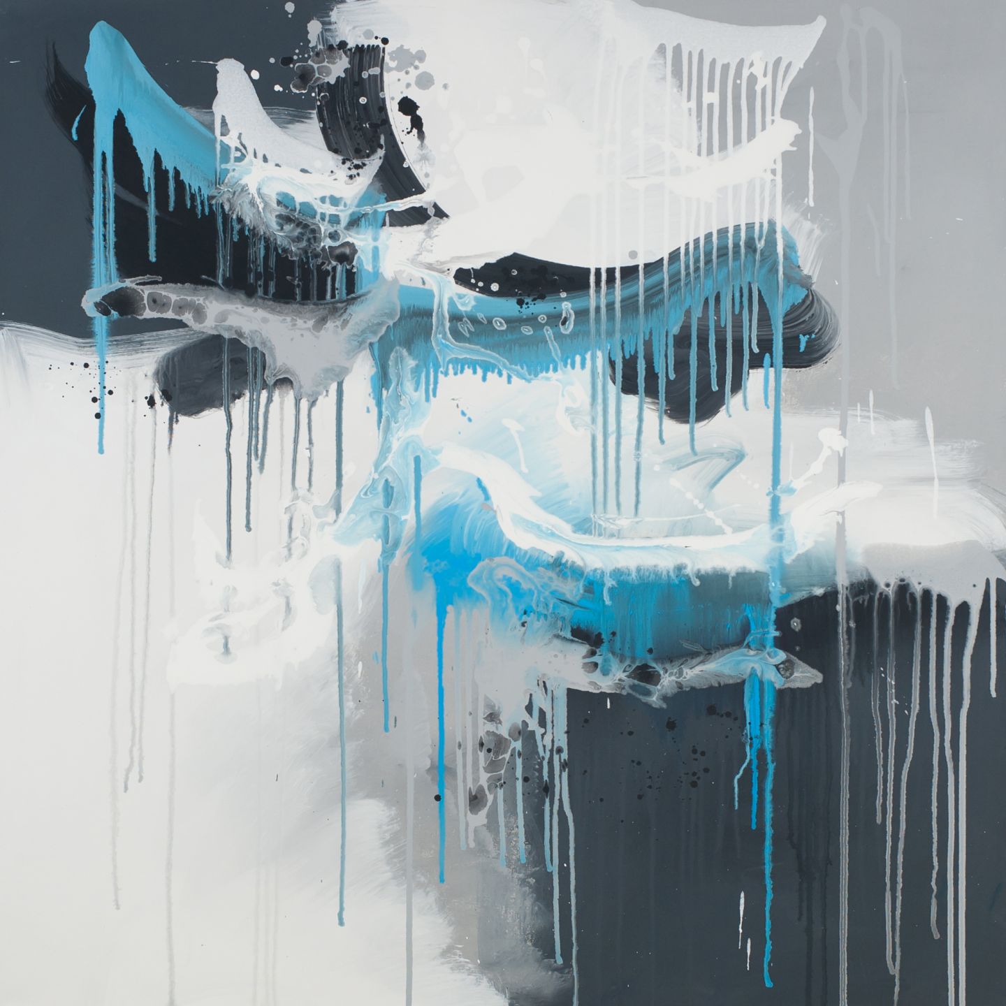 Beautiful grey abstract drip painting featuring black, white and a touch of soft aqua blue.