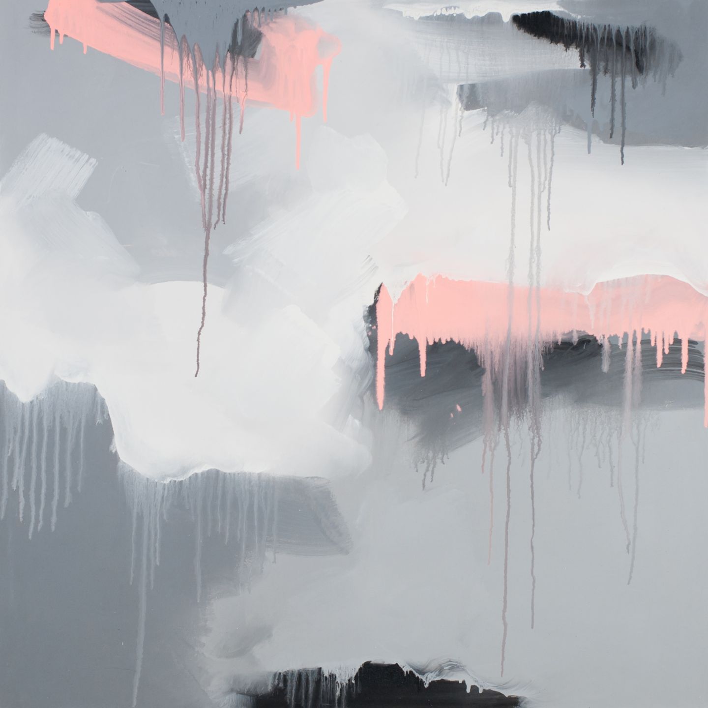Beautiful grey abstract drip painting featuring black, white and a touch of orange.