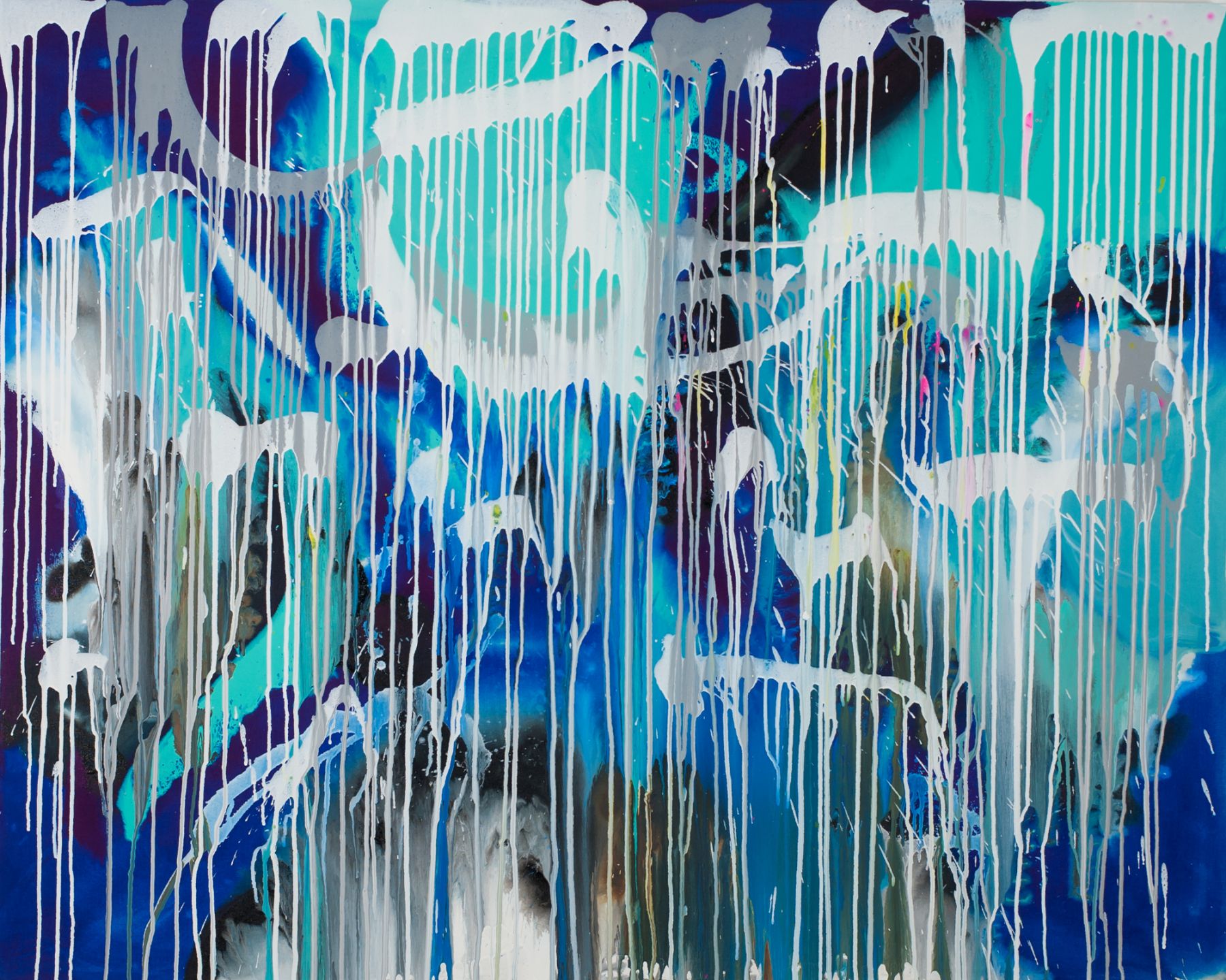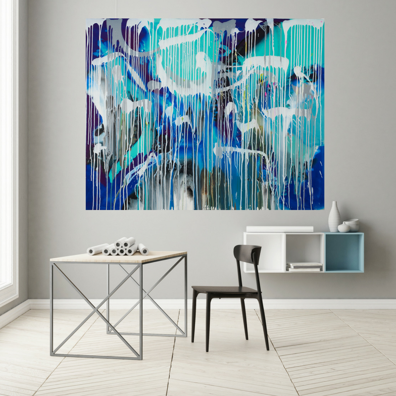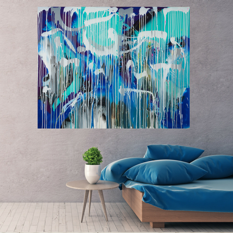 Beautiful abstract painting in shades of blue including aqua and deep blue.