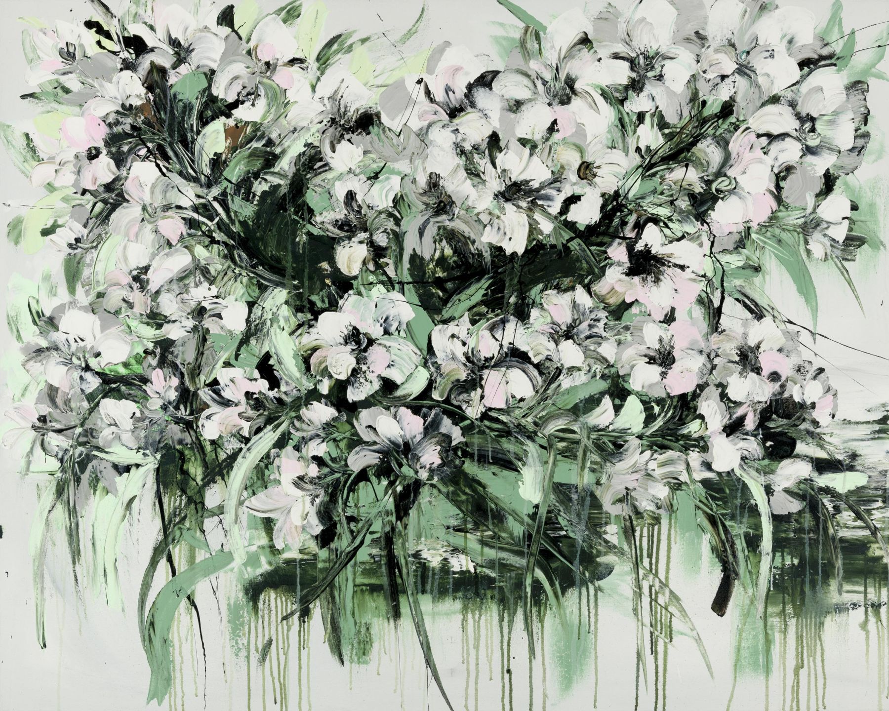 Beautiful abstract flowers painting featuring shades of green and white with hints of pink.