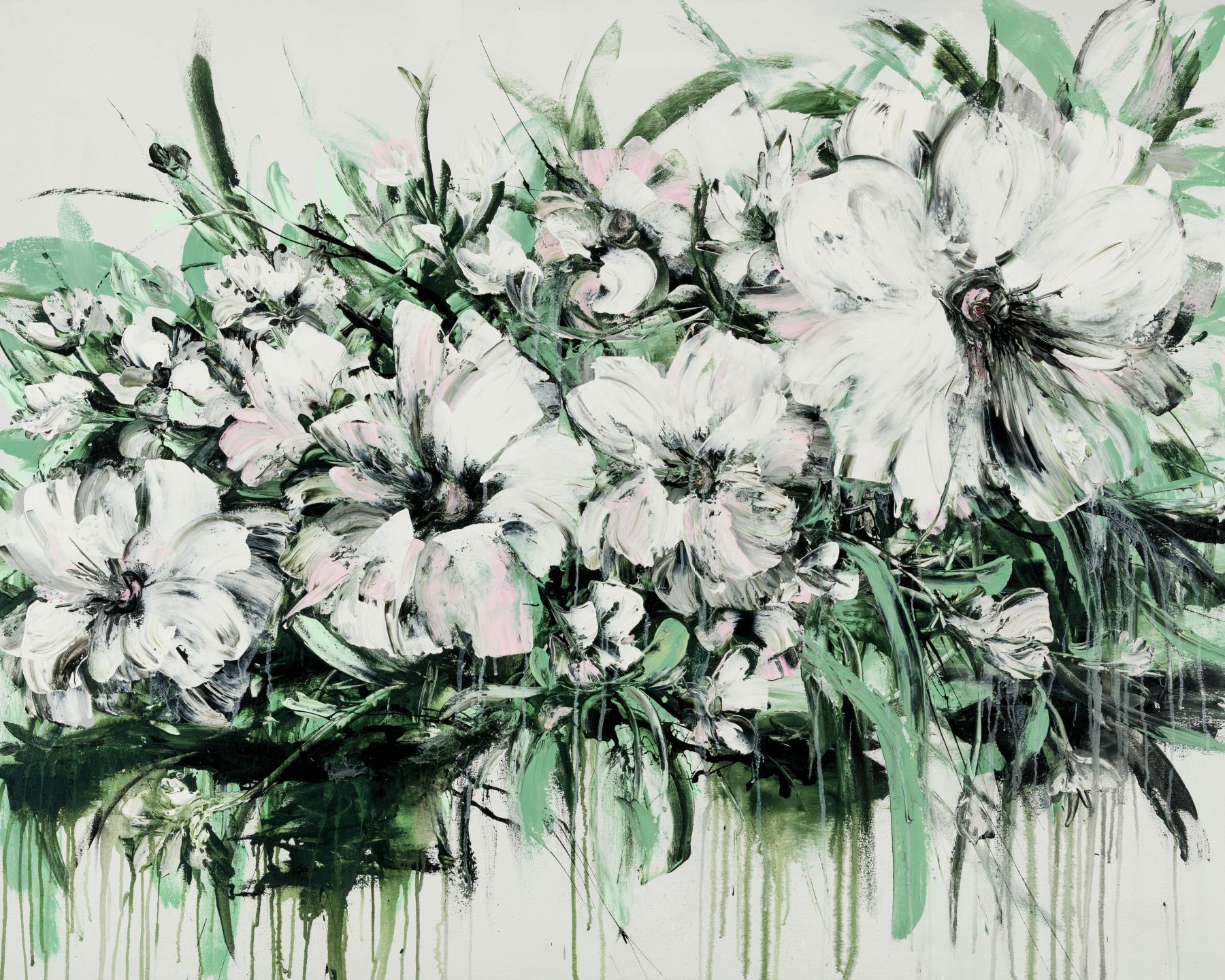 • Beautiful abstract flowers print featuring shades of green and white with hints of pink.