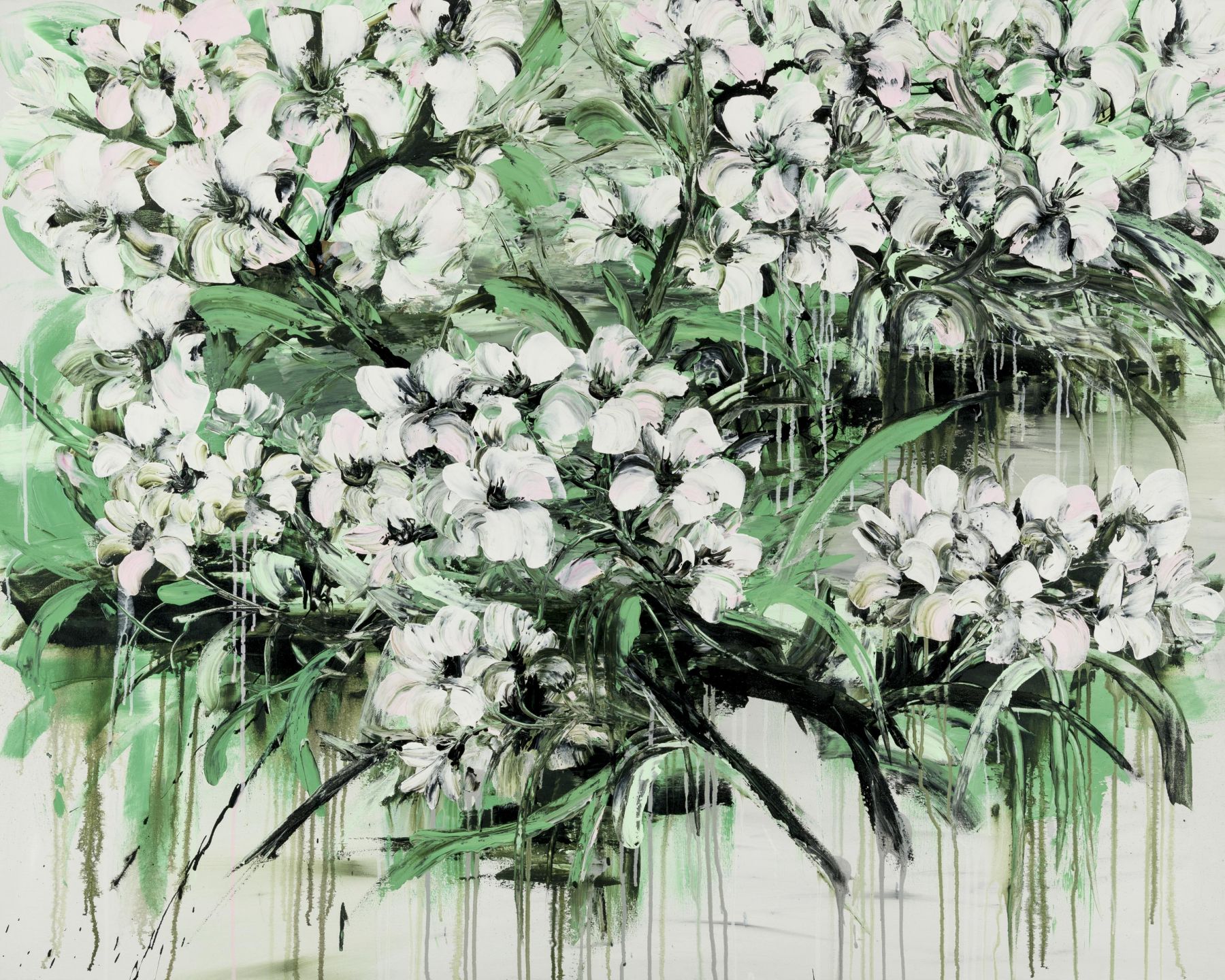 Beautiful abstract flowers painting featuring shades of green and white with hints of pink.