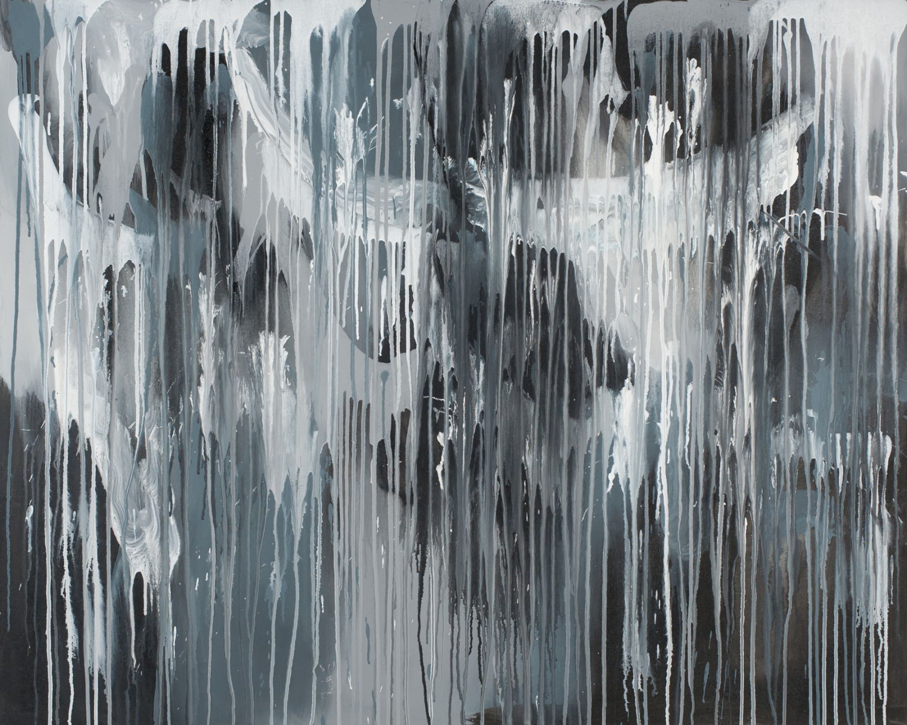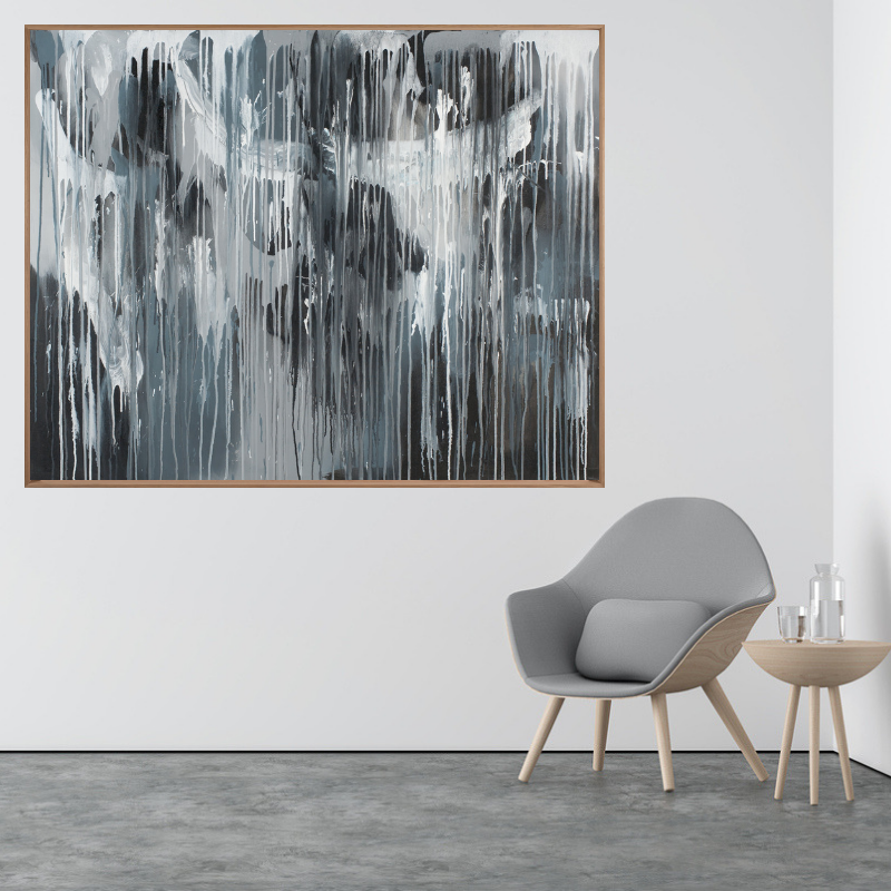 Beautiful monochromatic drip abstract painting featuring shades of grey, black and white.