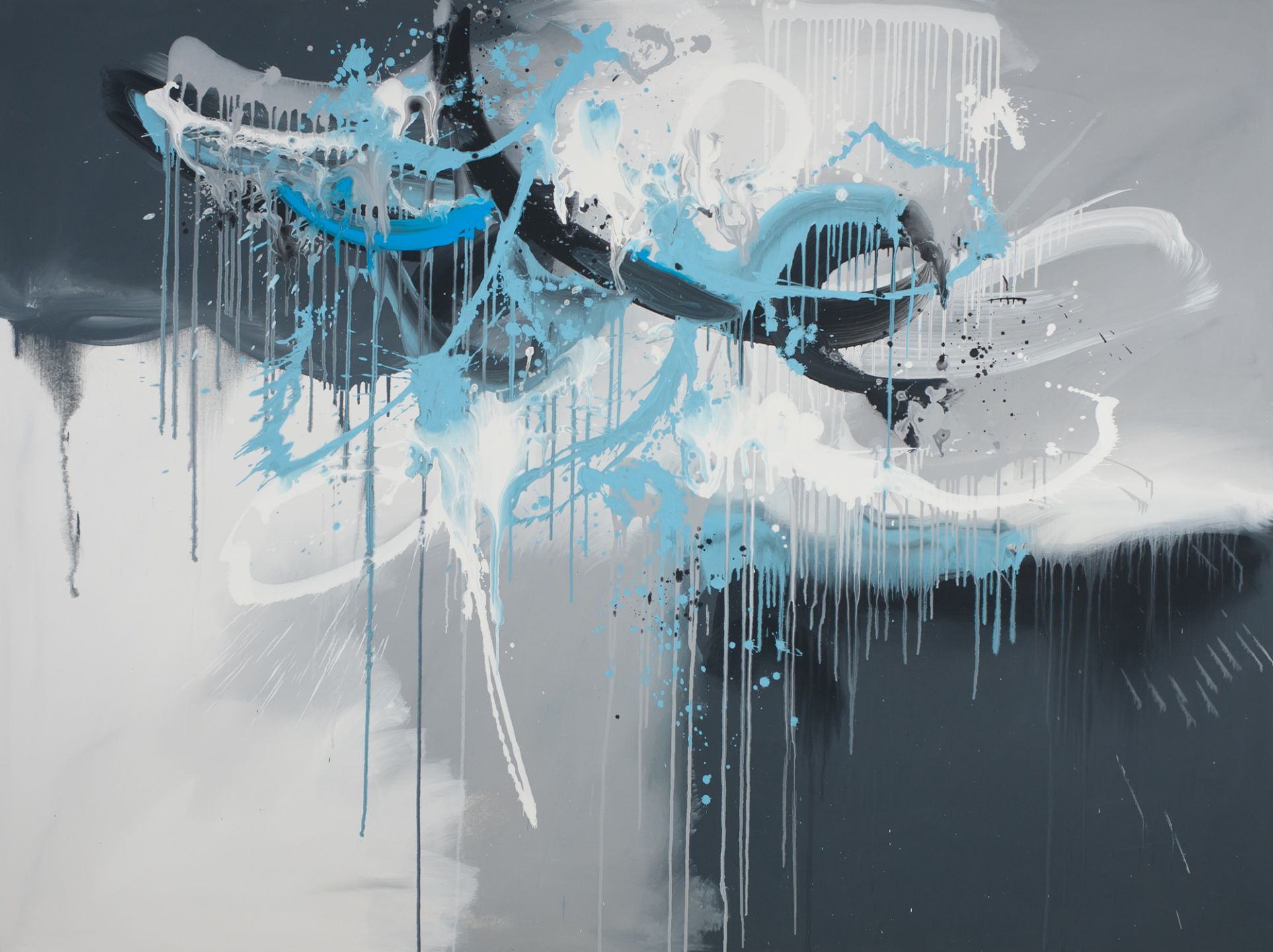 Beautiful grey abstract drip painting featuring black, white and a touch of soft blue.