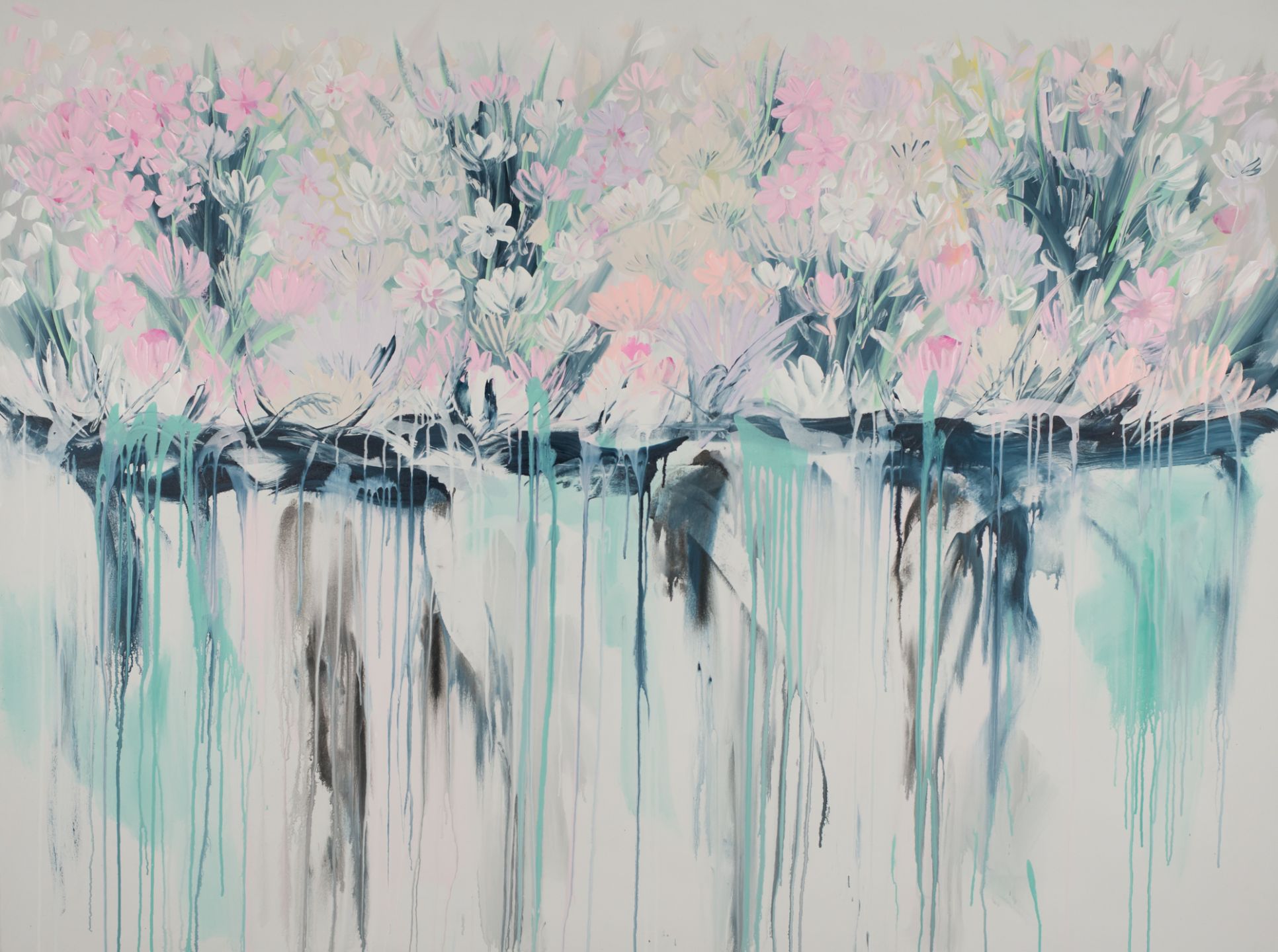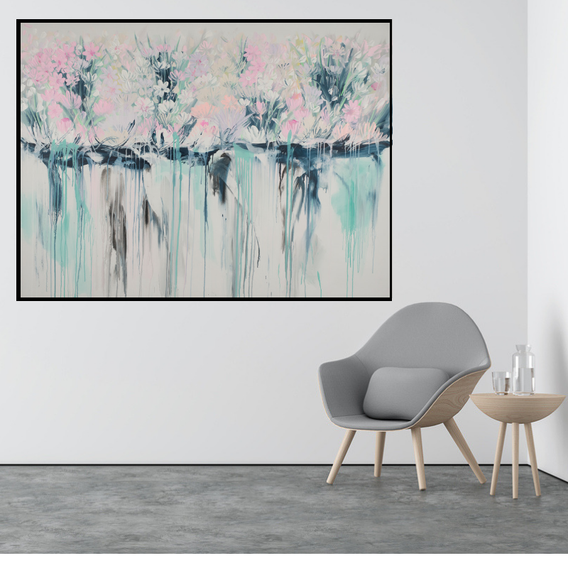 Beautiful drip flowers painting featuring pretty pastel shades of pink, coral, aqua and navy.