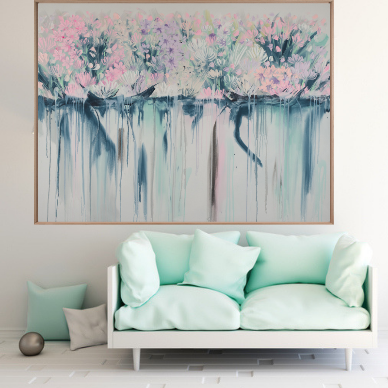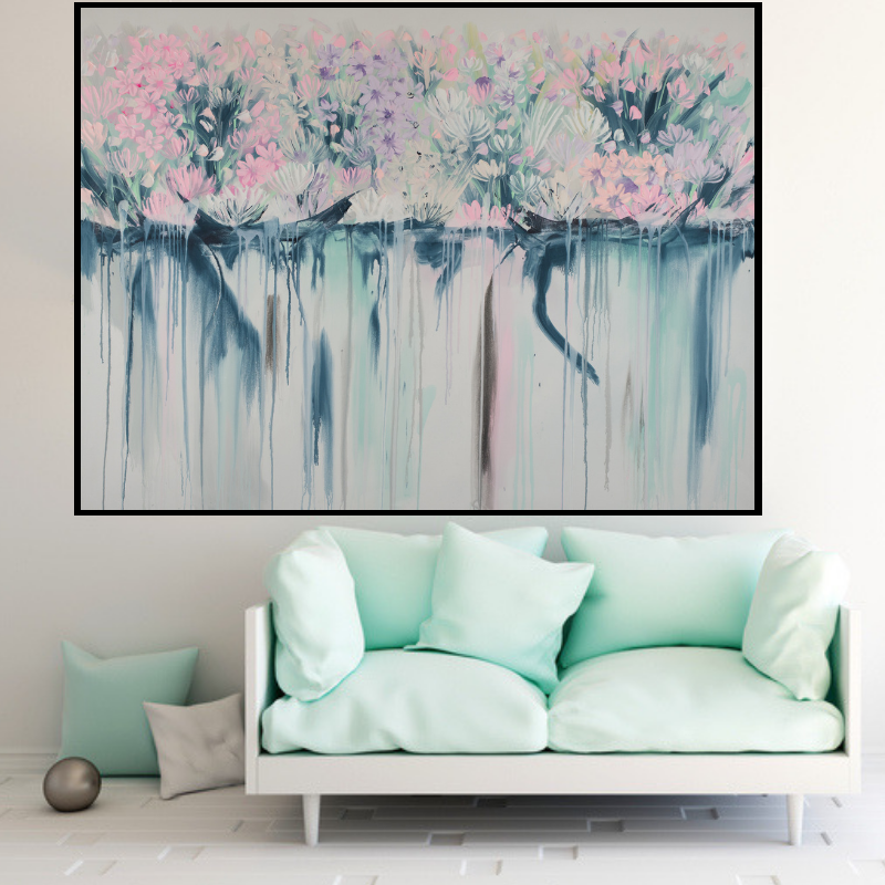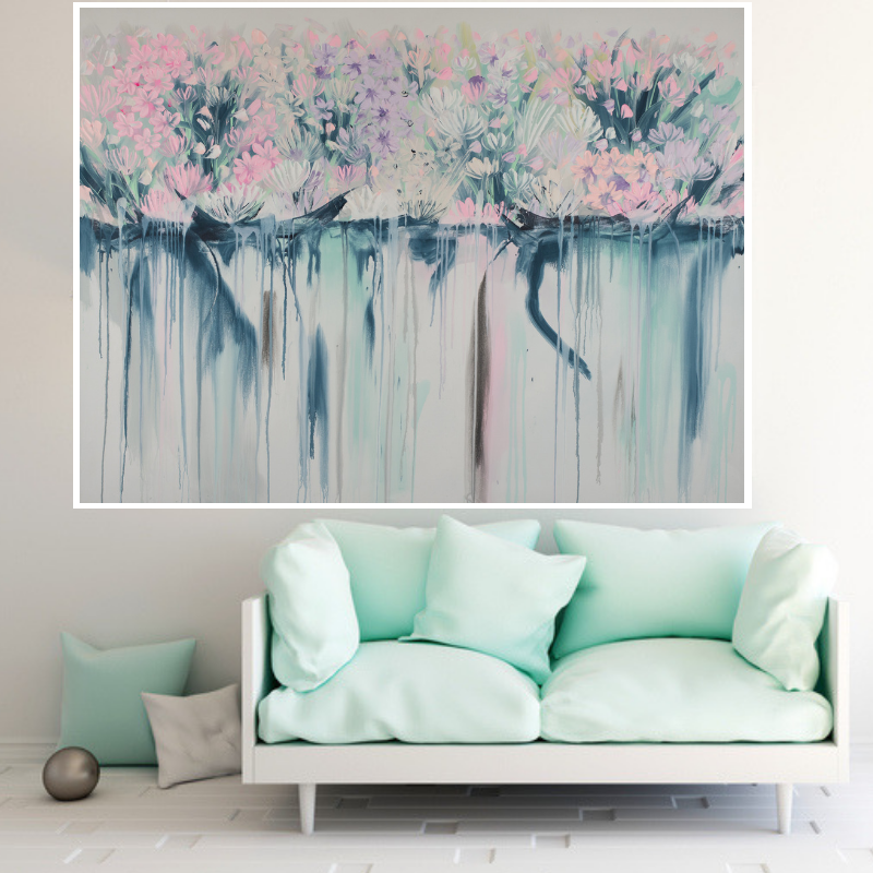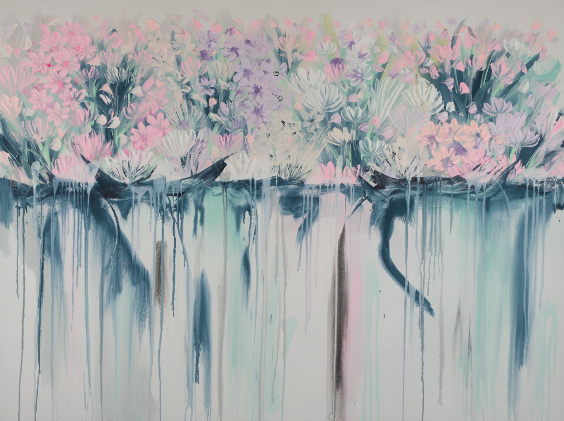 Beautiful drip flowers painting featuring pretty pastel shades of pink, lilac, aqua and navy.