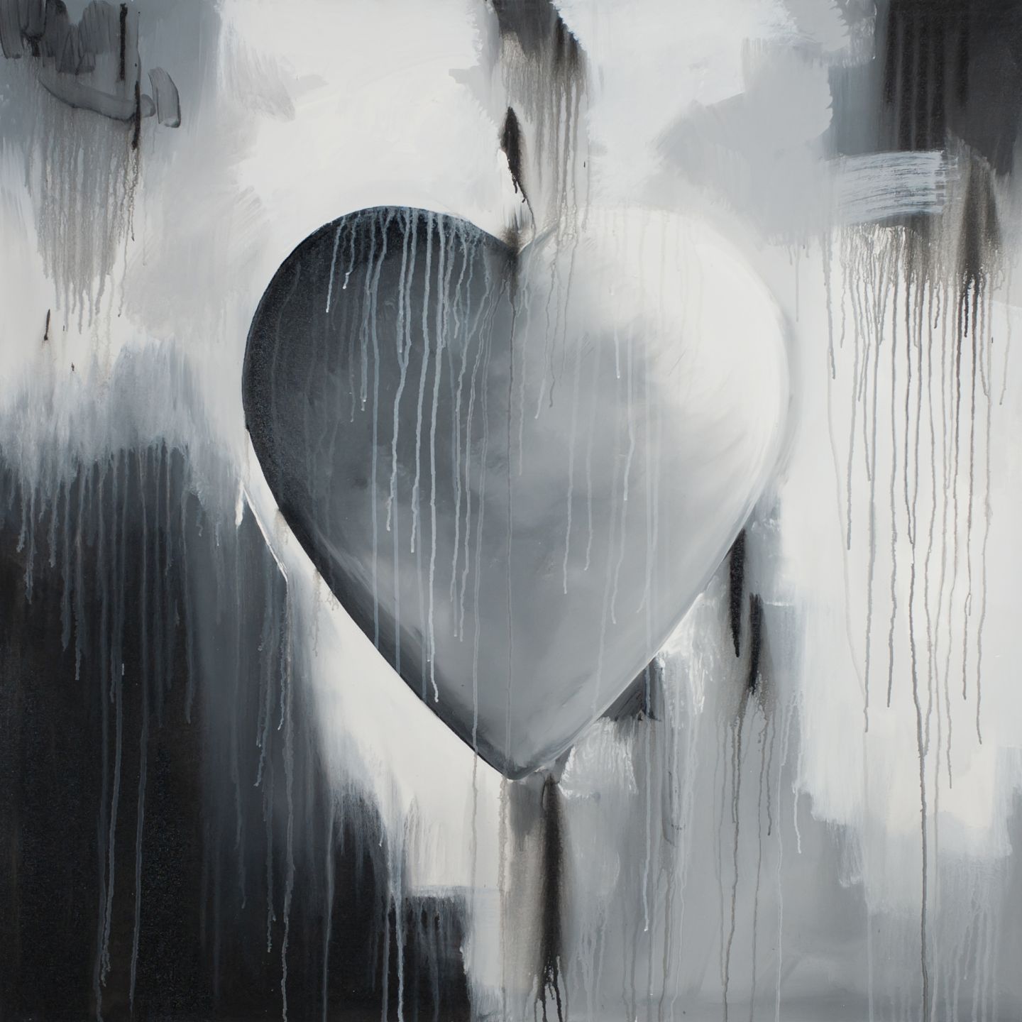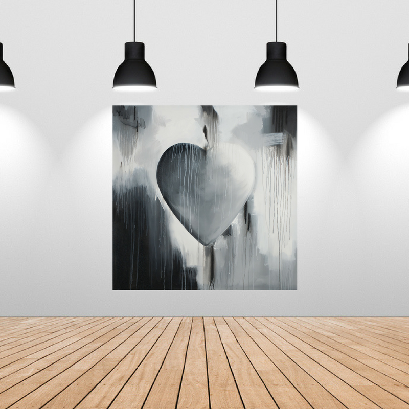Beautiful black and white abstract heart painting with drips. Featuring black, white and shades of grey.