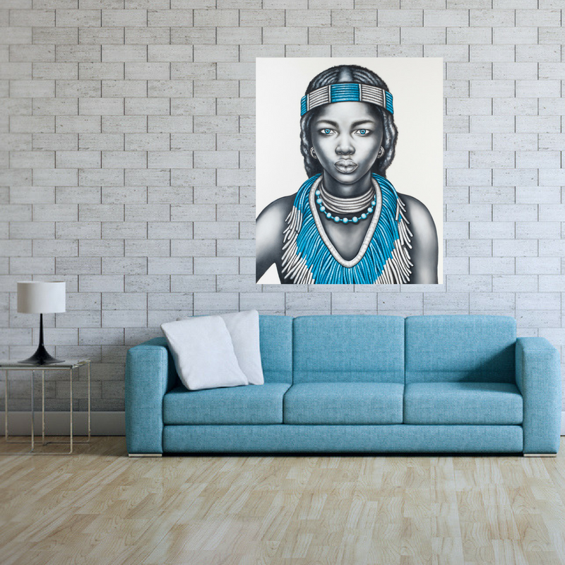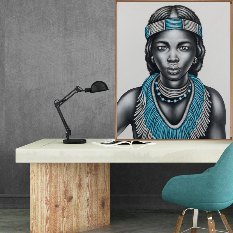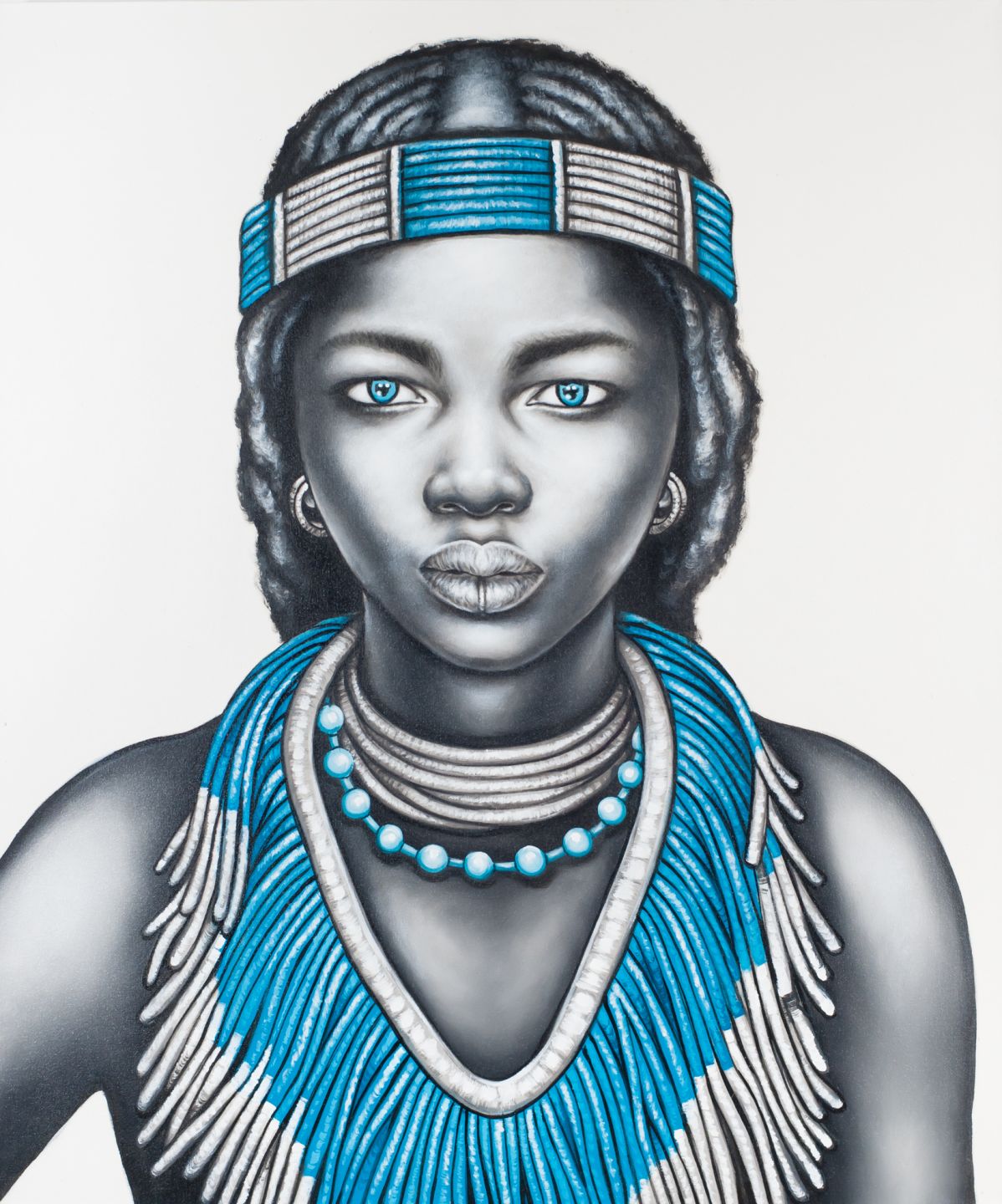 Beautiful handpainted black and white tribal girl with lip ring and aqua jewellery.