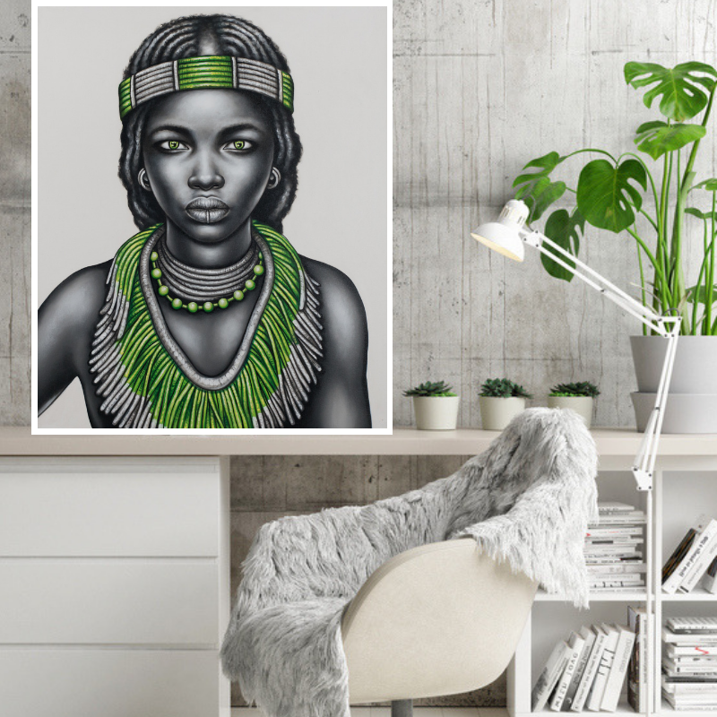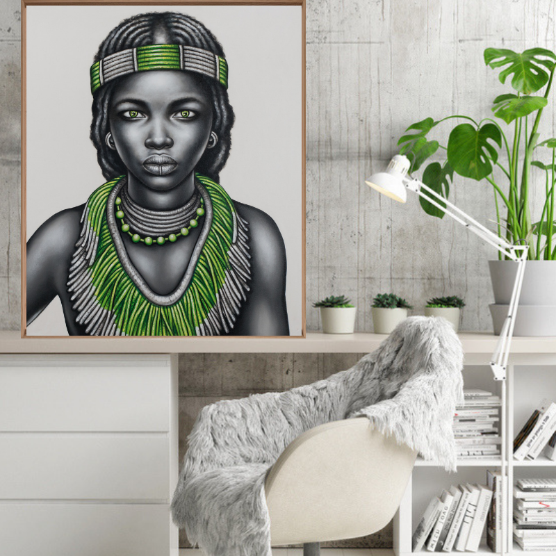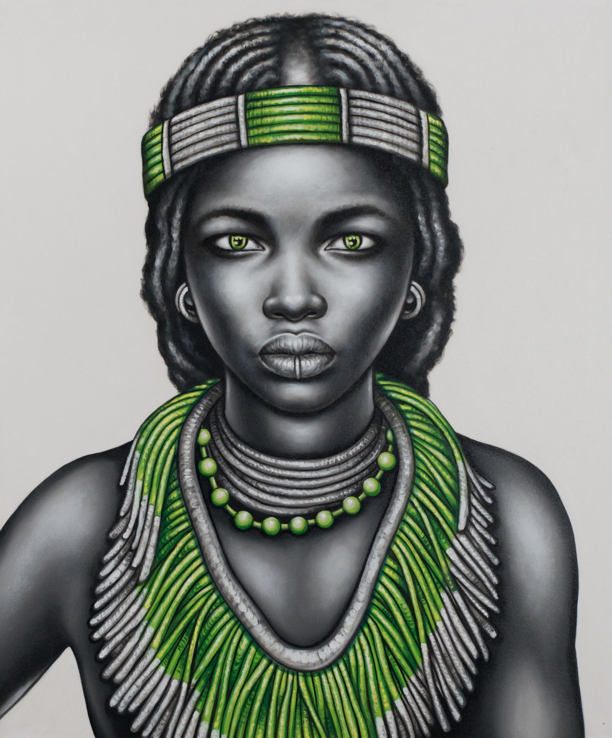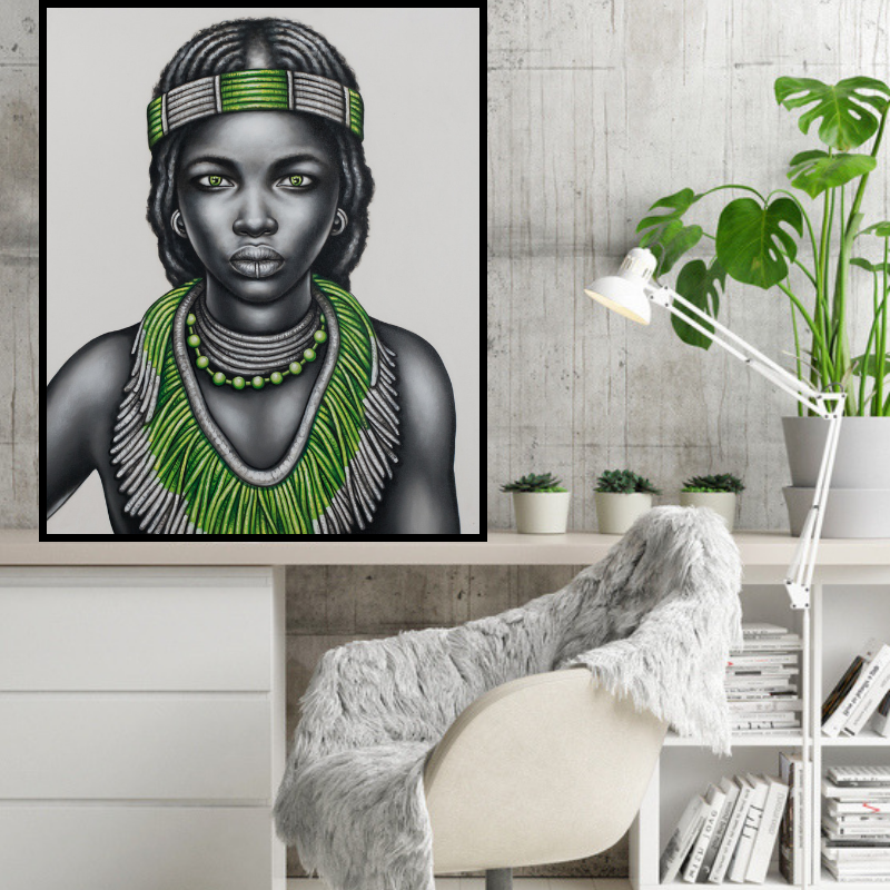 Beautiful handpainted black and white tribal girl with lip ring and green jewellery.