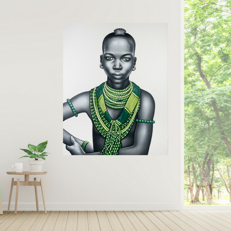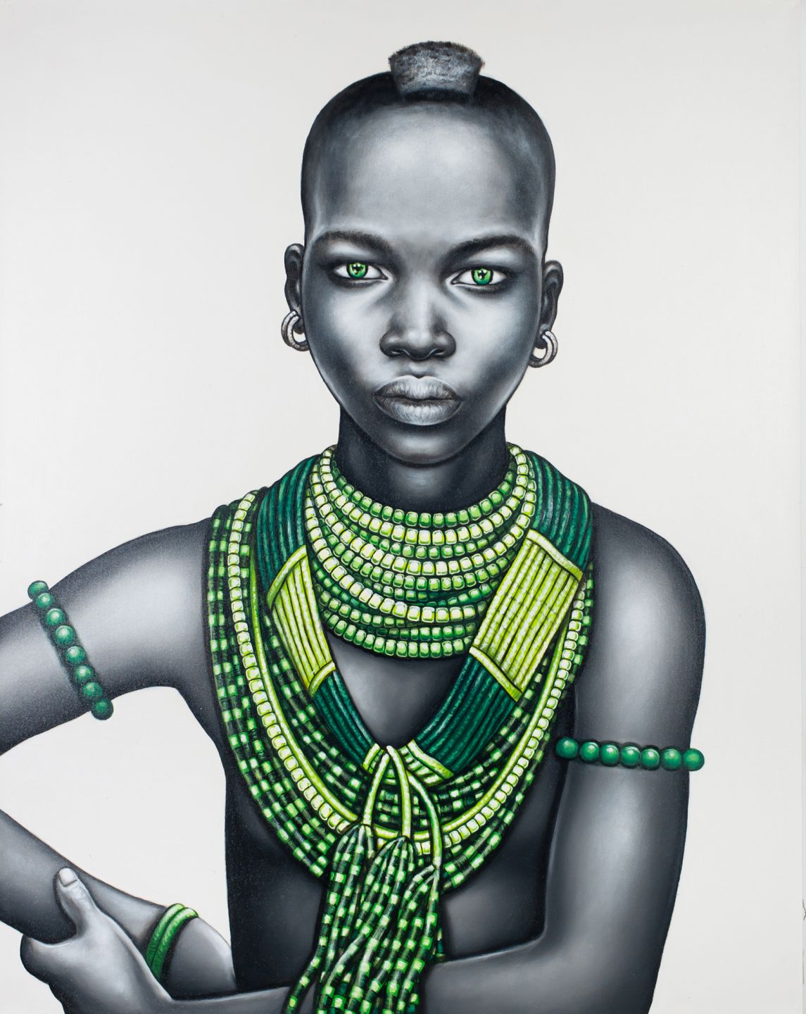 Beautiful handpainted black and white tribal girl with mohawk on white background.