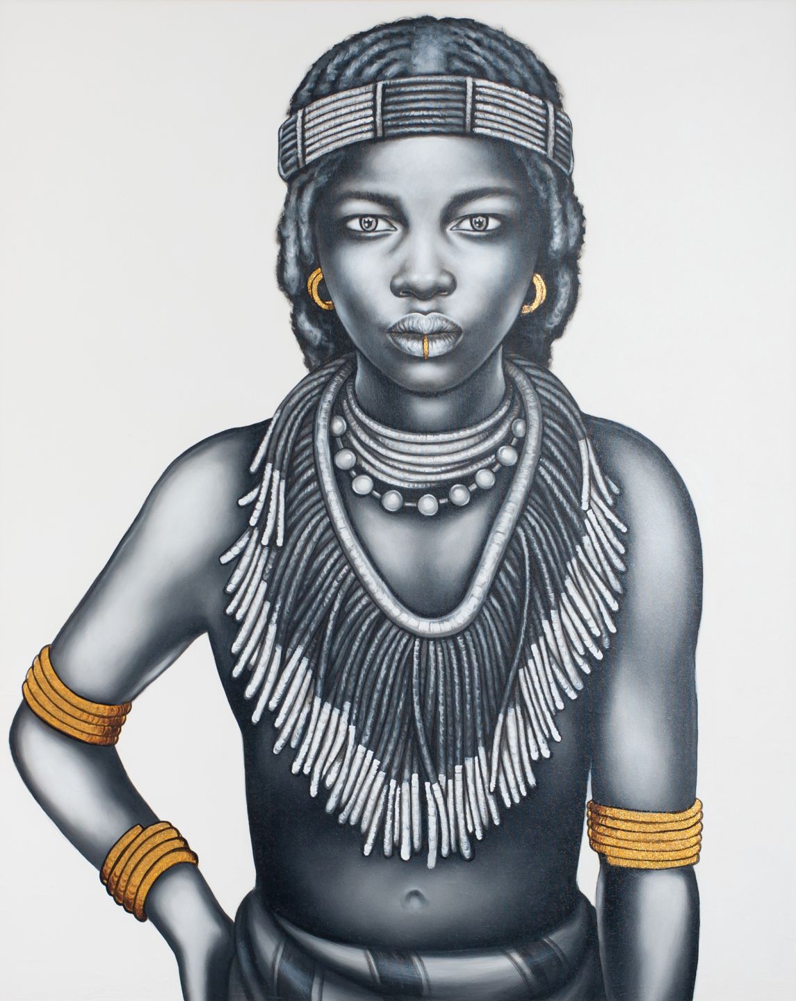 The 'Tribal girl with gold foil jewellery and lip ring' on white background.