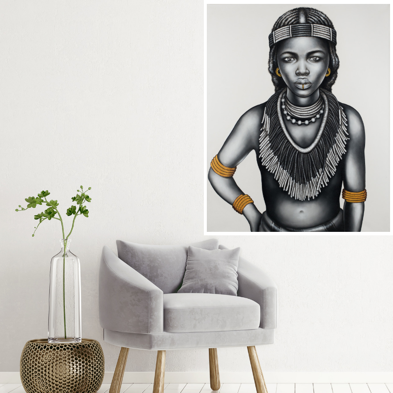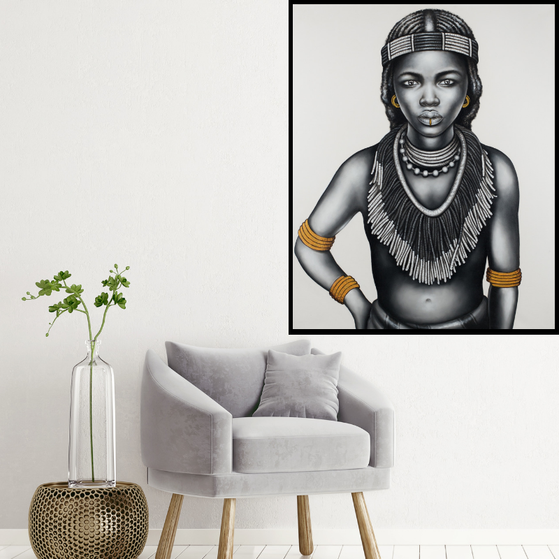 Beautiful handpainted black and white tribal girl with gold foil jewellery.