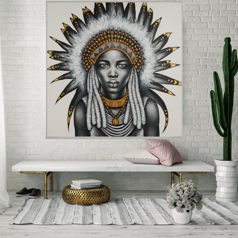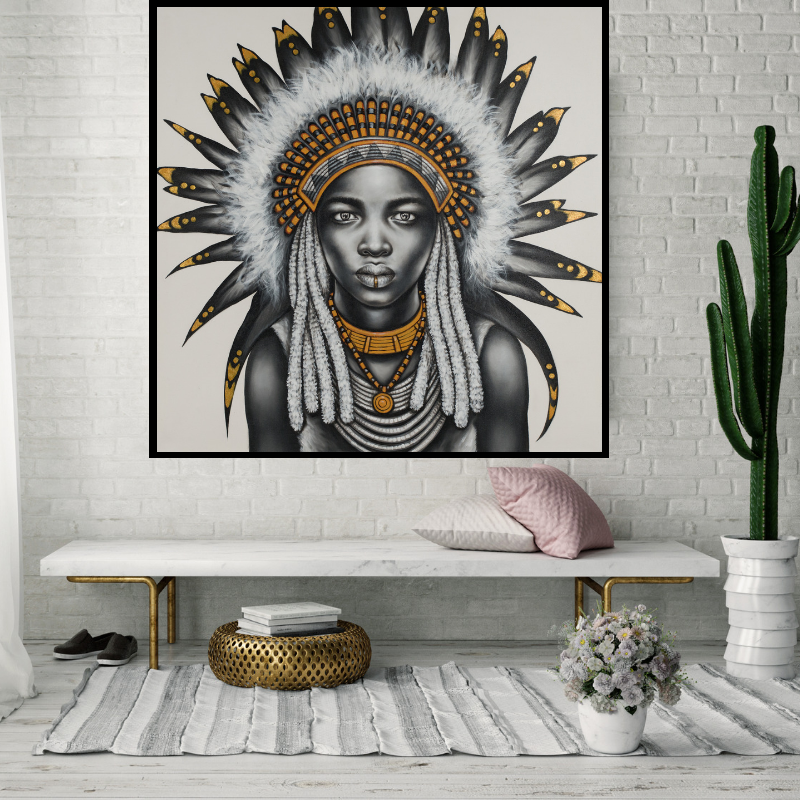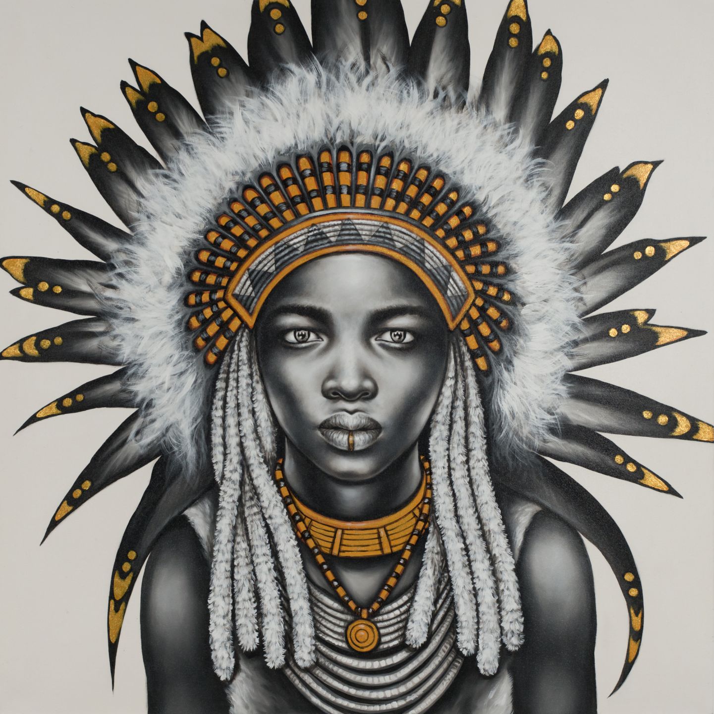 Beautiful handpainted black and white tribal girl with feather headpiece and gold foil jewellery.