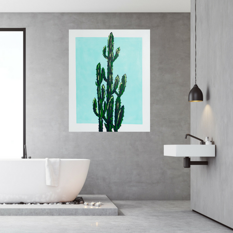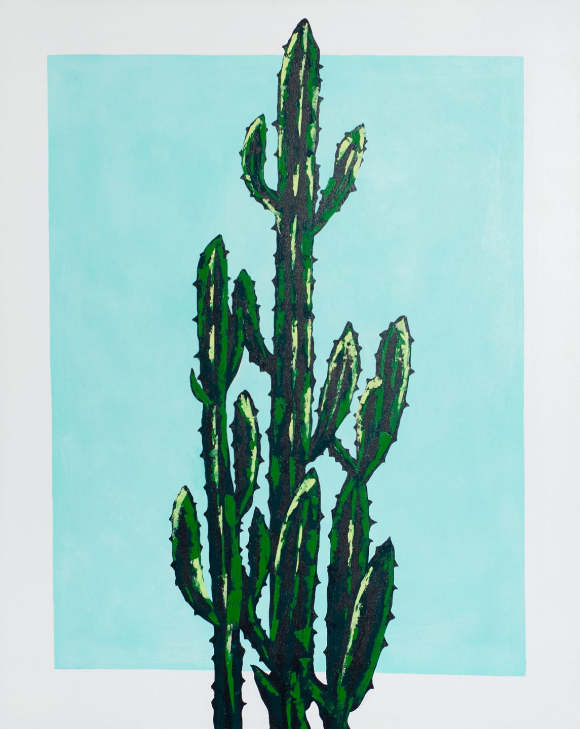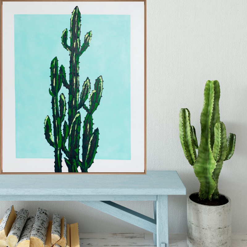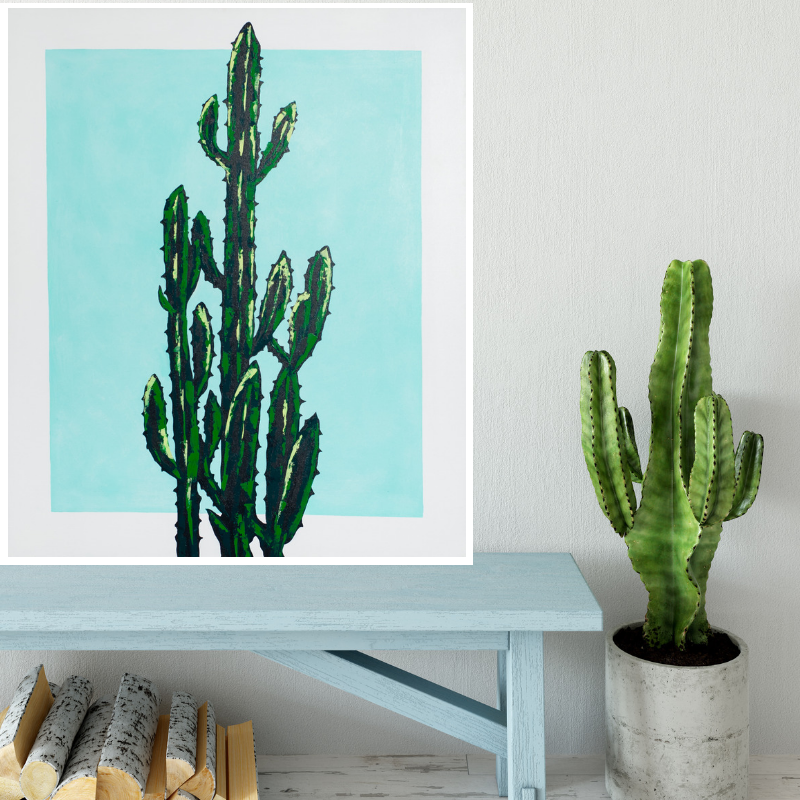 Beautiful hand painted cactus plant on a soft aqua rectangle background with white border.