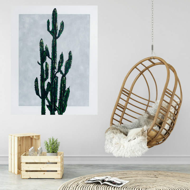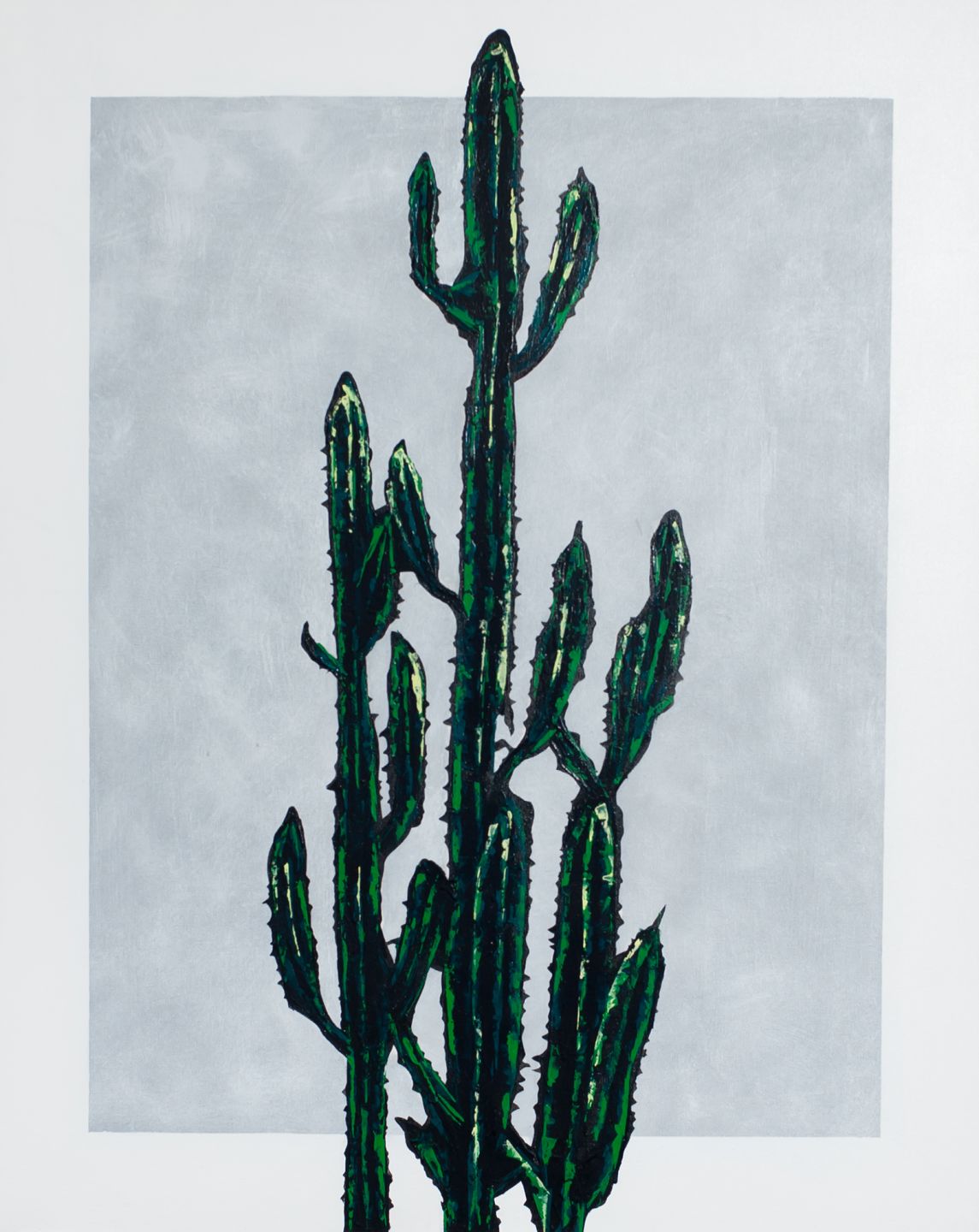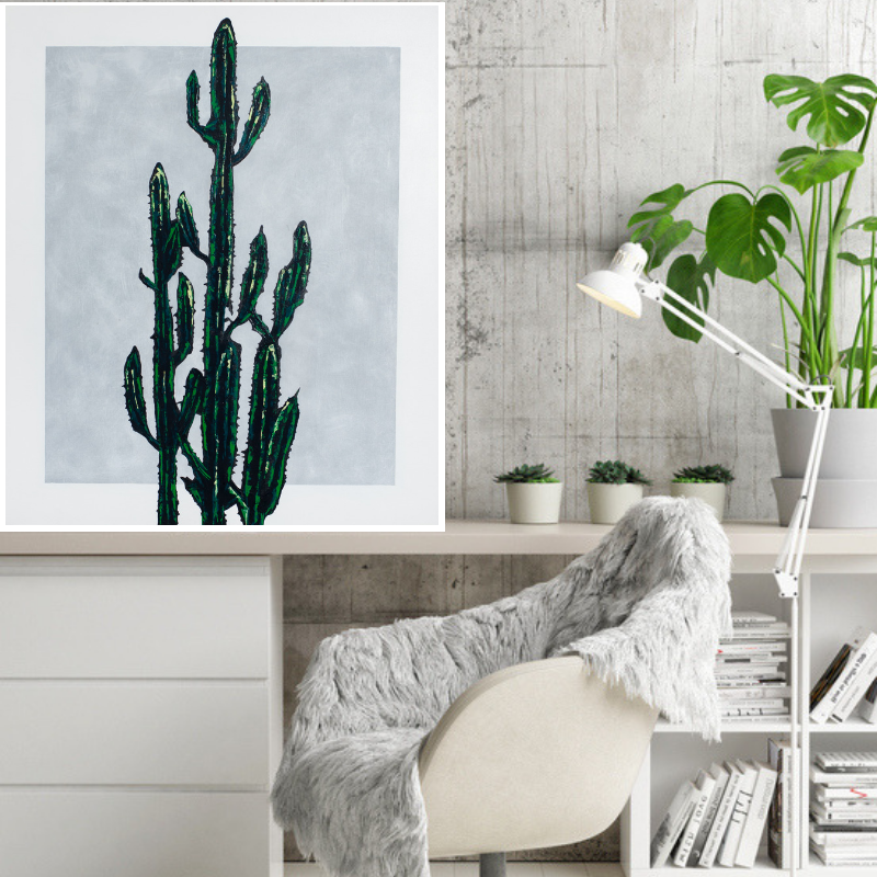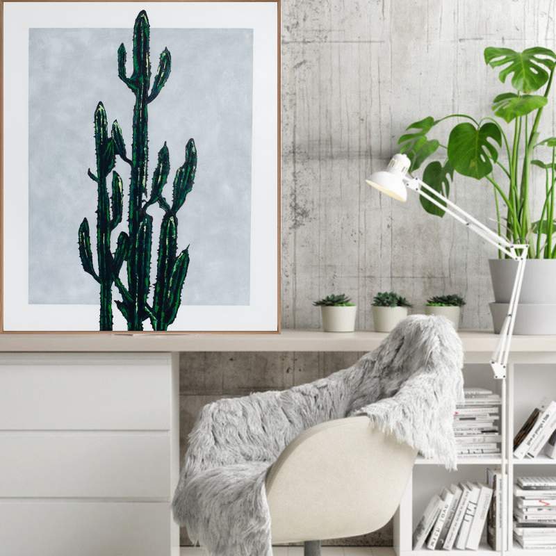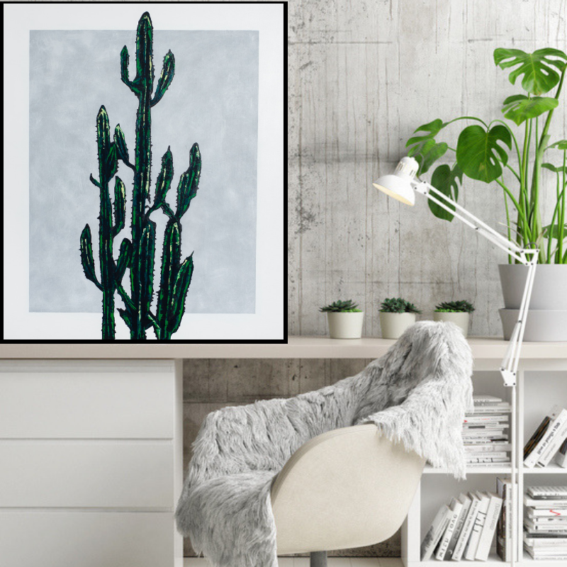 Beautiful hand painted cactus plant on a soft aqua rectangle background with white border.
