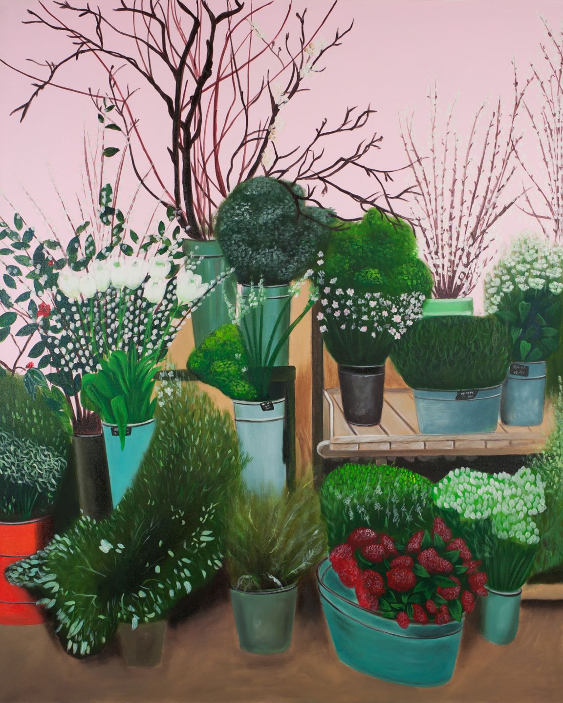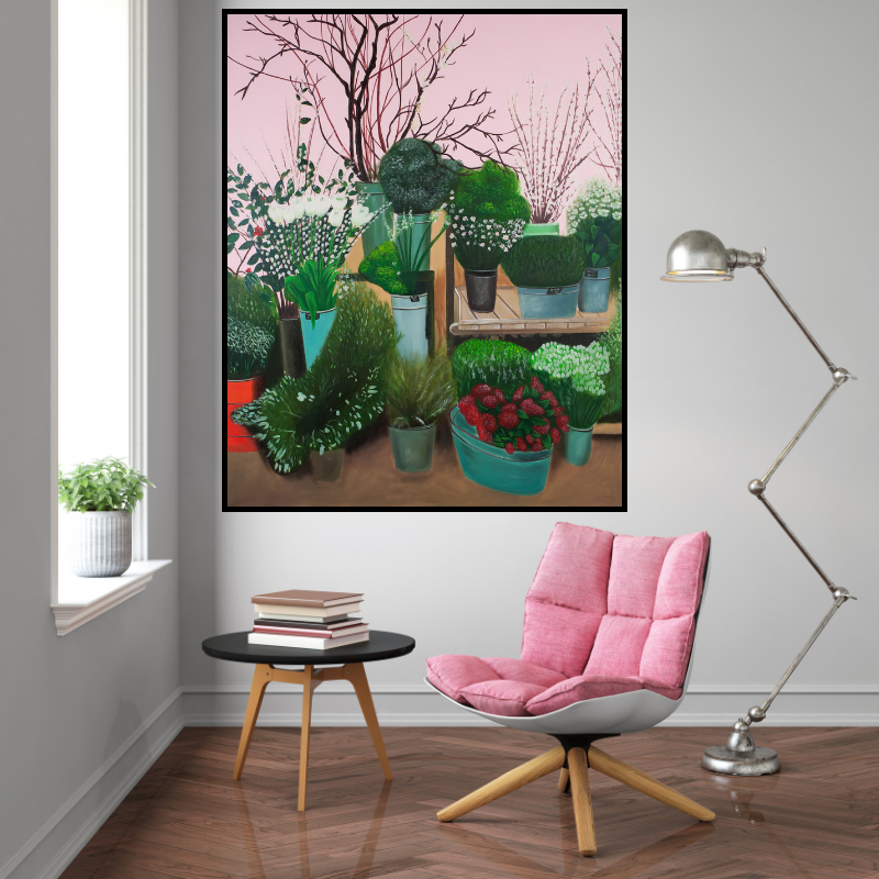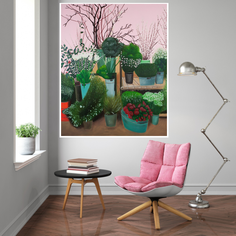 Beautiful hand painted flowers in tins on a pale pink wall.