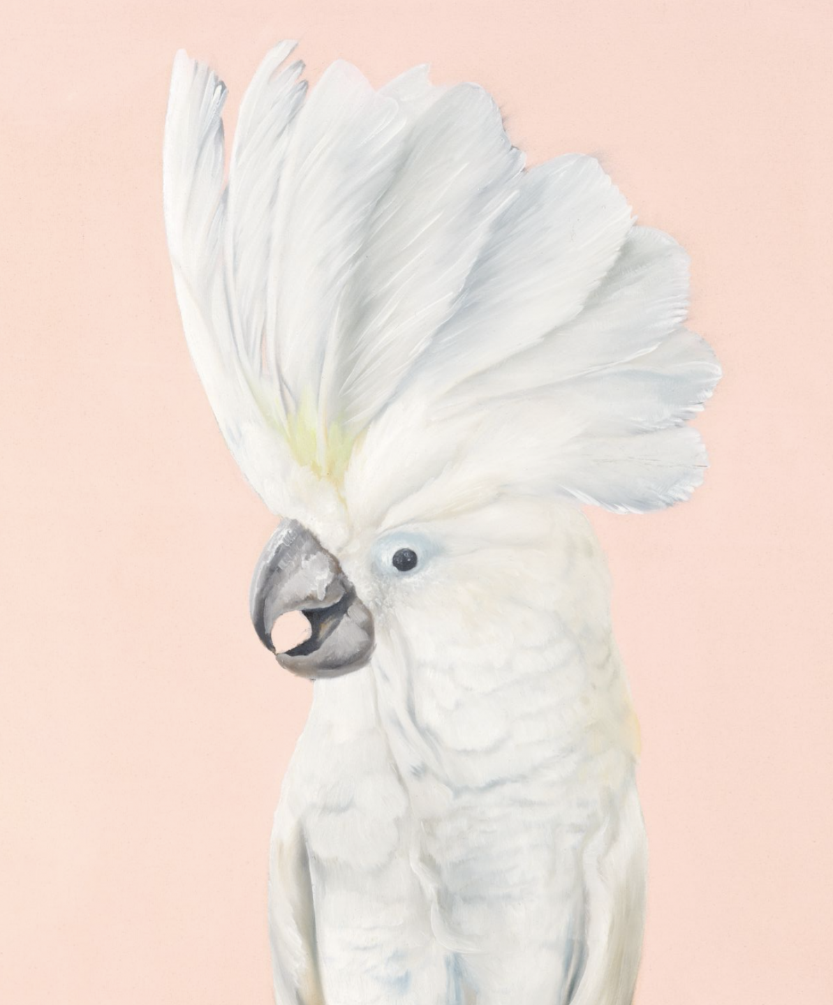 A beautiful print of a white cockatoo on a soft pale pink background. This print is of an original Colour Clash Studio painting.