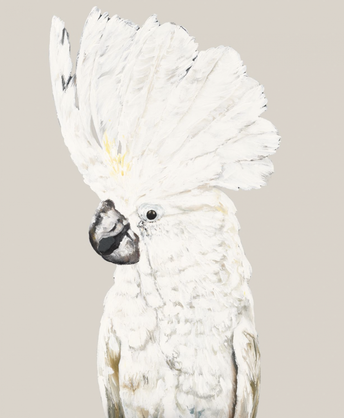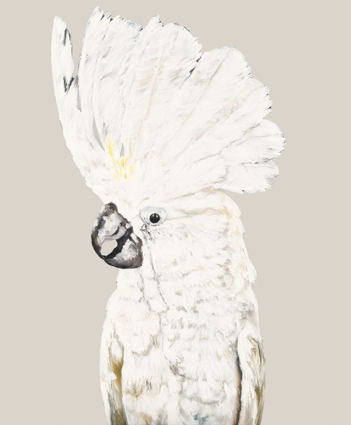 A beautiful print of a white cockatoo on a beige background. This print is of an original Colour Clash Studio painting.