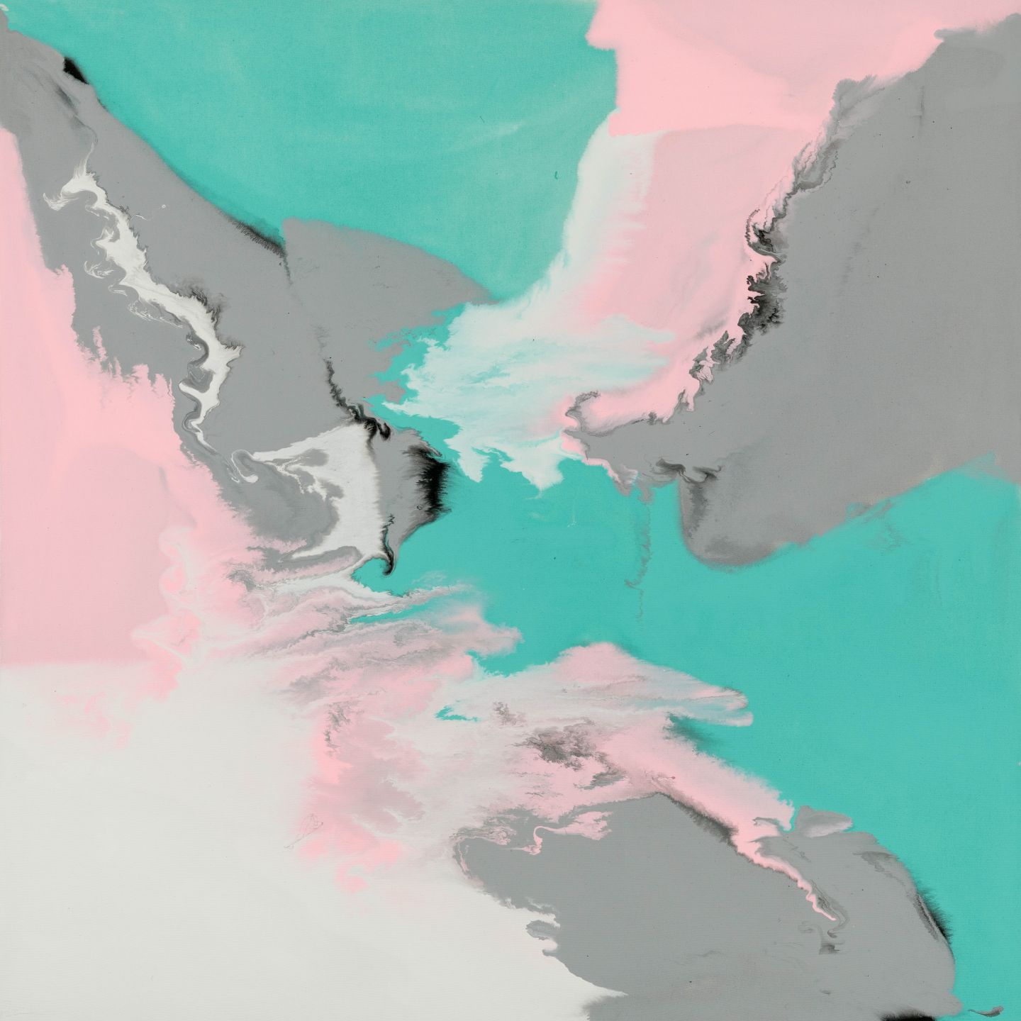 Beautiful pastel multicoloured abstract print featuring aqua, pale pink, bright pink, blue, grey and white.