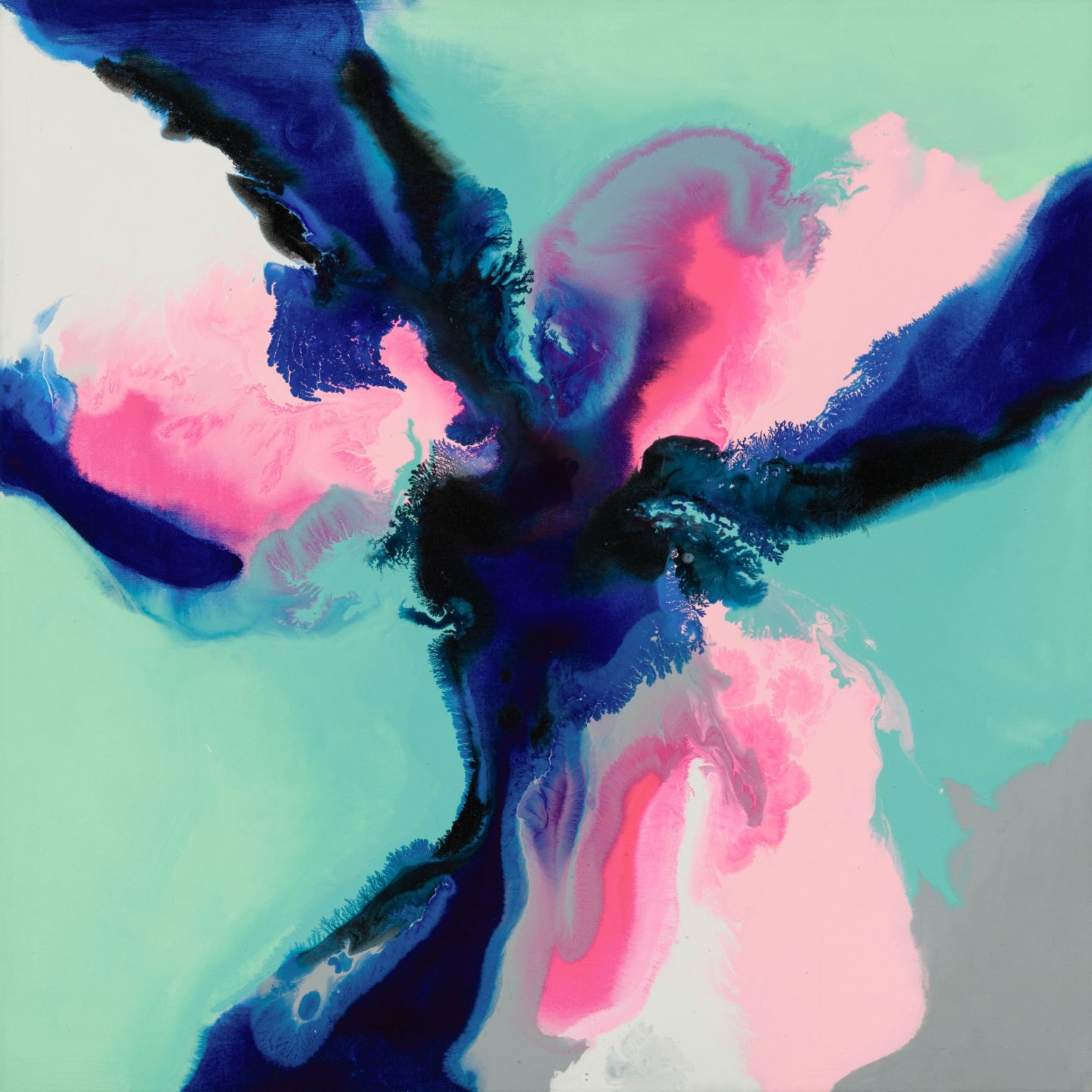 Beautiful bright multicoloured abstract print featuring blue, pink, green, grey and white colour fusion design.