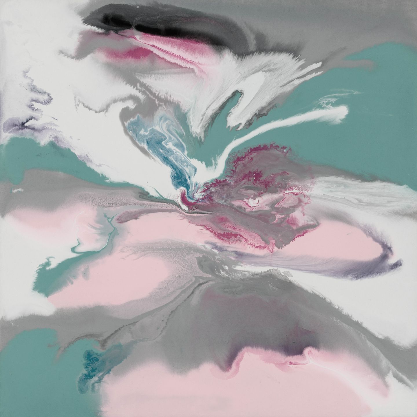 Beautiful pastel multicolor abstract painting featuring aqua, pale pink, grey and white