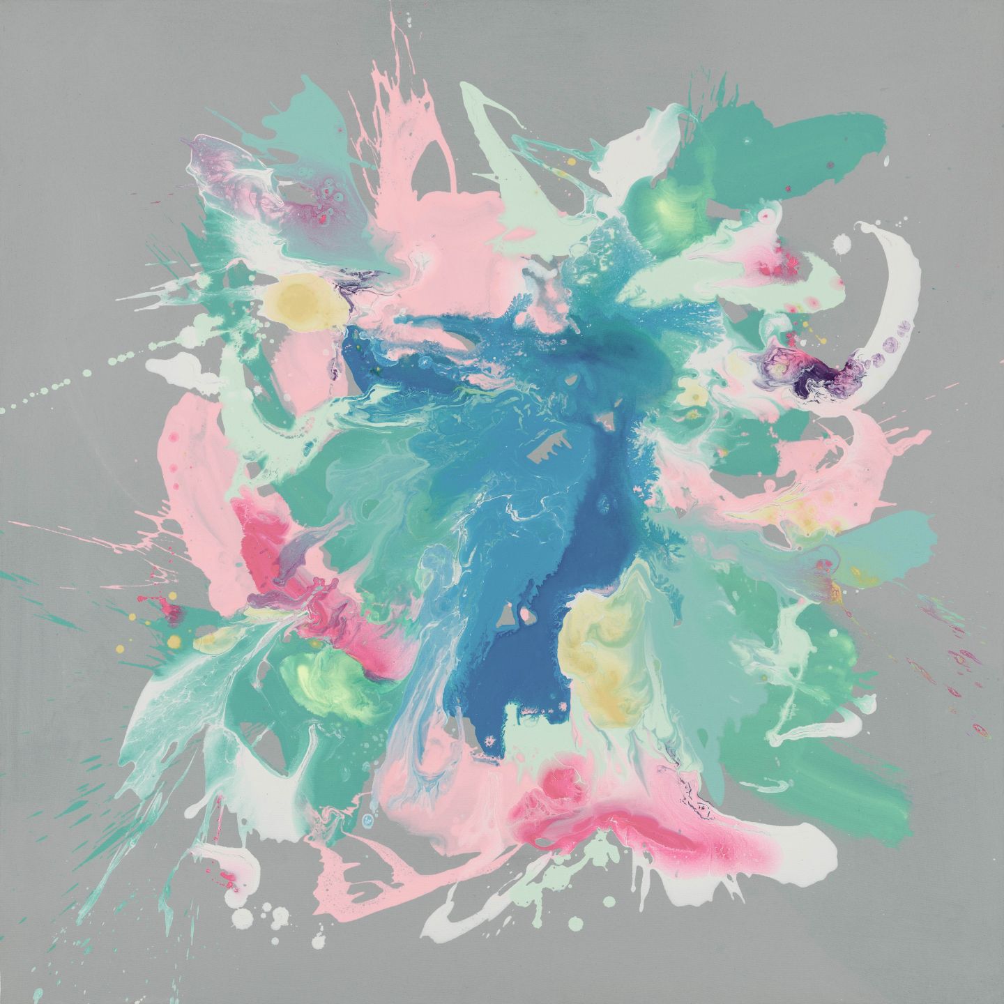 Beautiful grey abstract print featuring a central splash of aqua, mint, baby blue, baby pink, bright pink, and white.