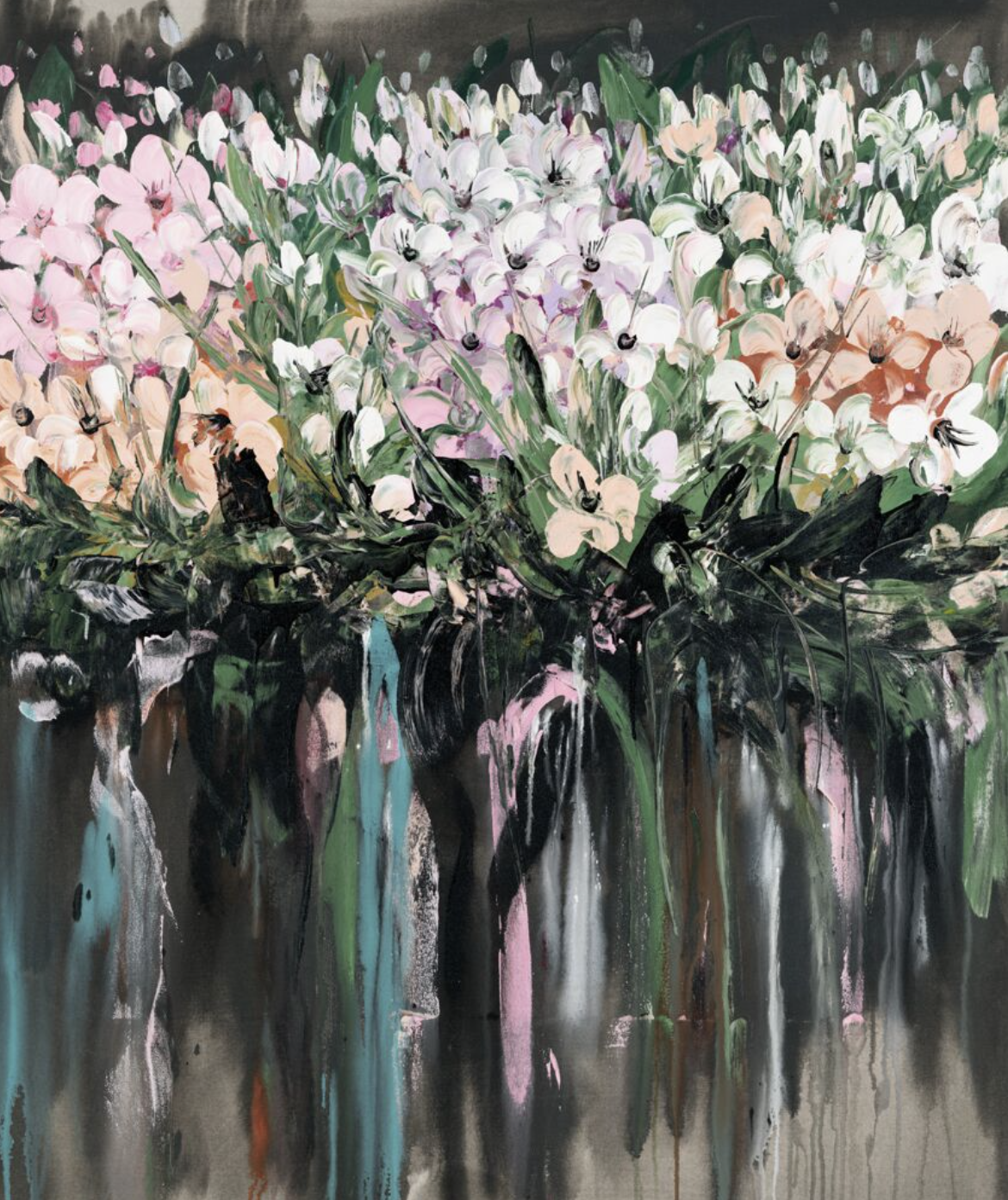 Beautiful drip flowers print featuring shades of pink, green, coral, lilac, navy, yellow & aqua on a charcoal background.