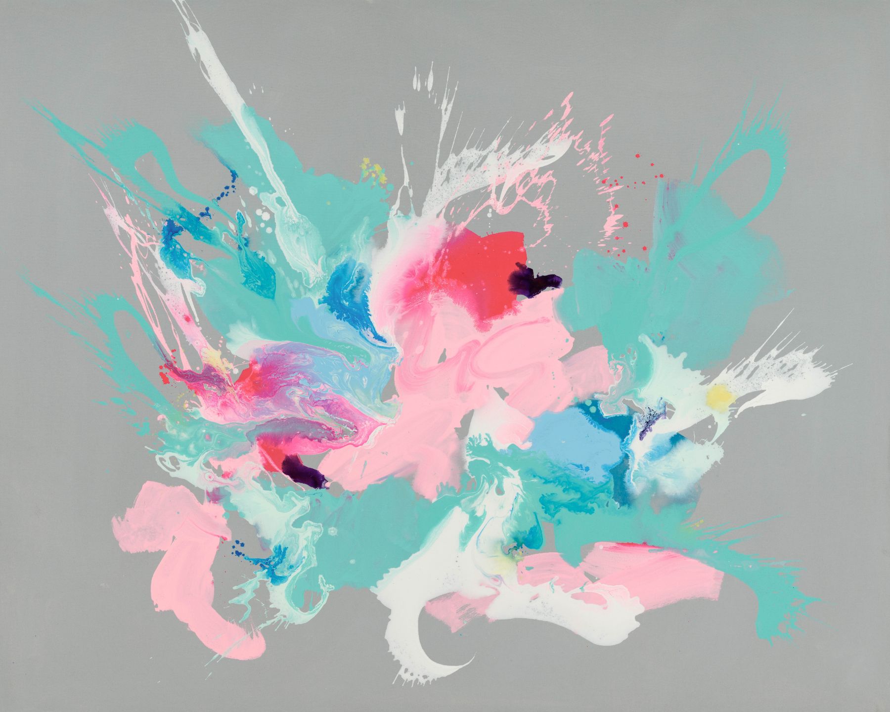 Beautiful grey abstract print featuring a central splash of aqua, mint, baby blue, baby pink, bright pink, and white.