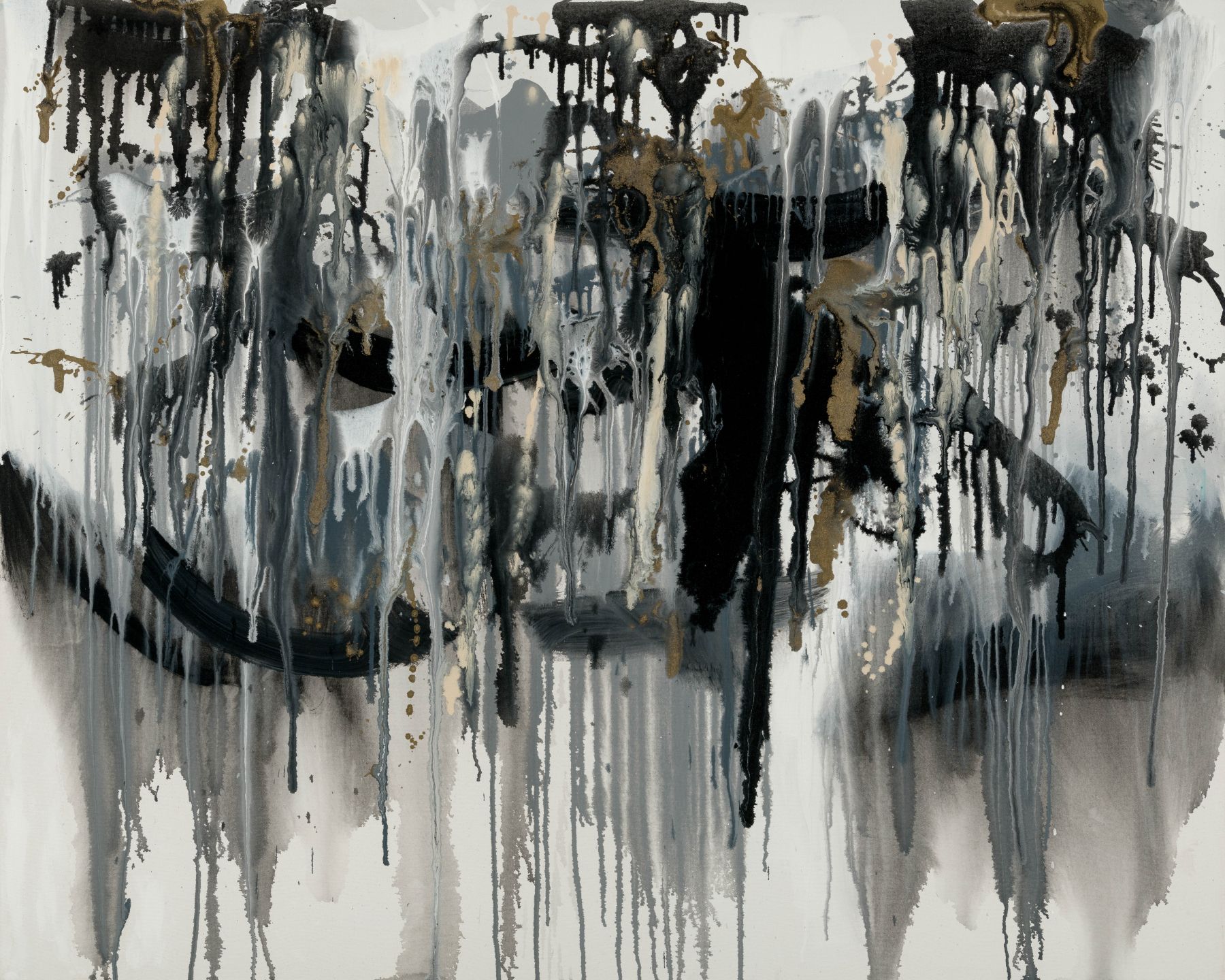 Beautiful monochromic drip abstract print featuring shades of grey, black and white with gold tone drips.