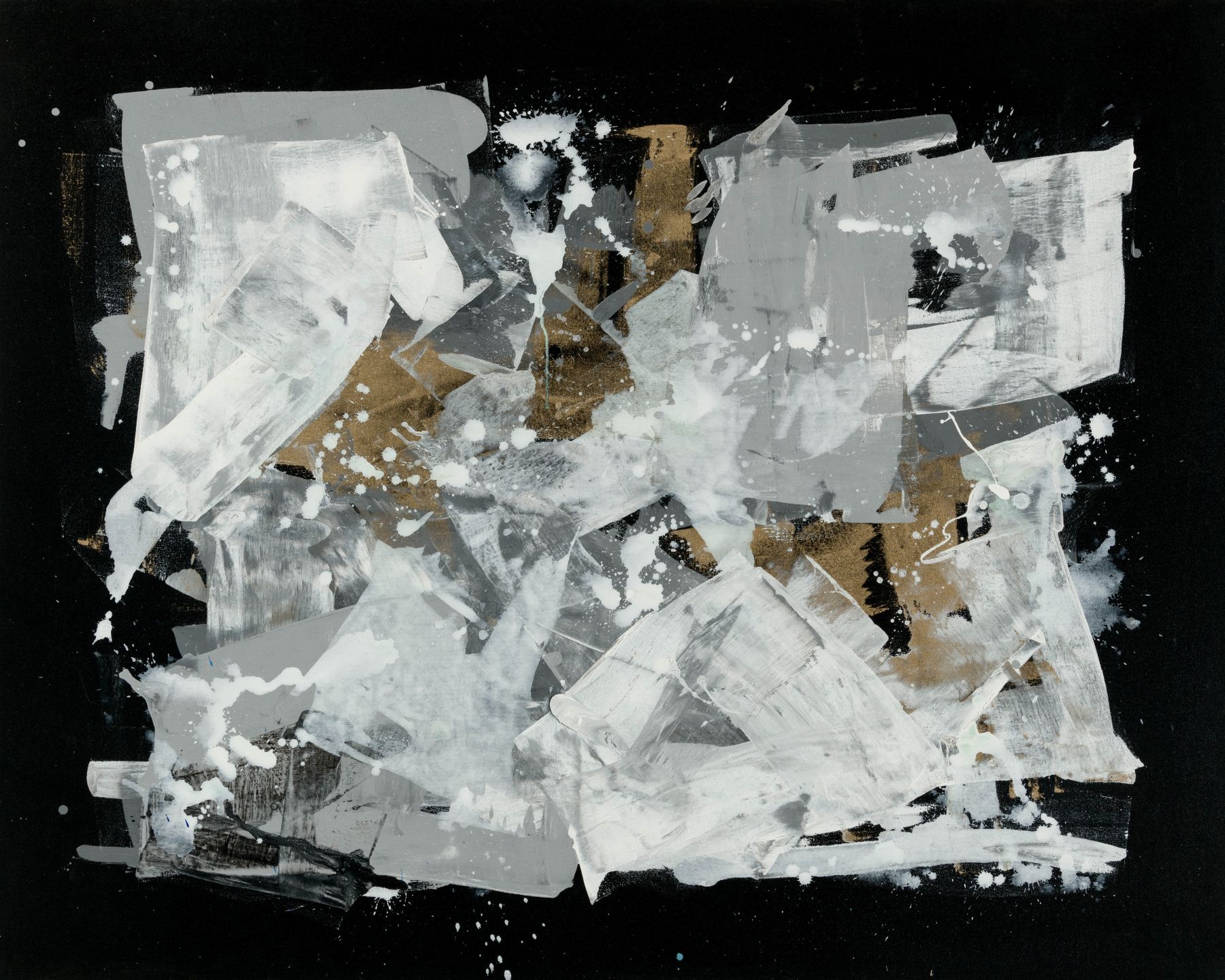Beautiful abstract print featuring a central splash of a gold tone and white.