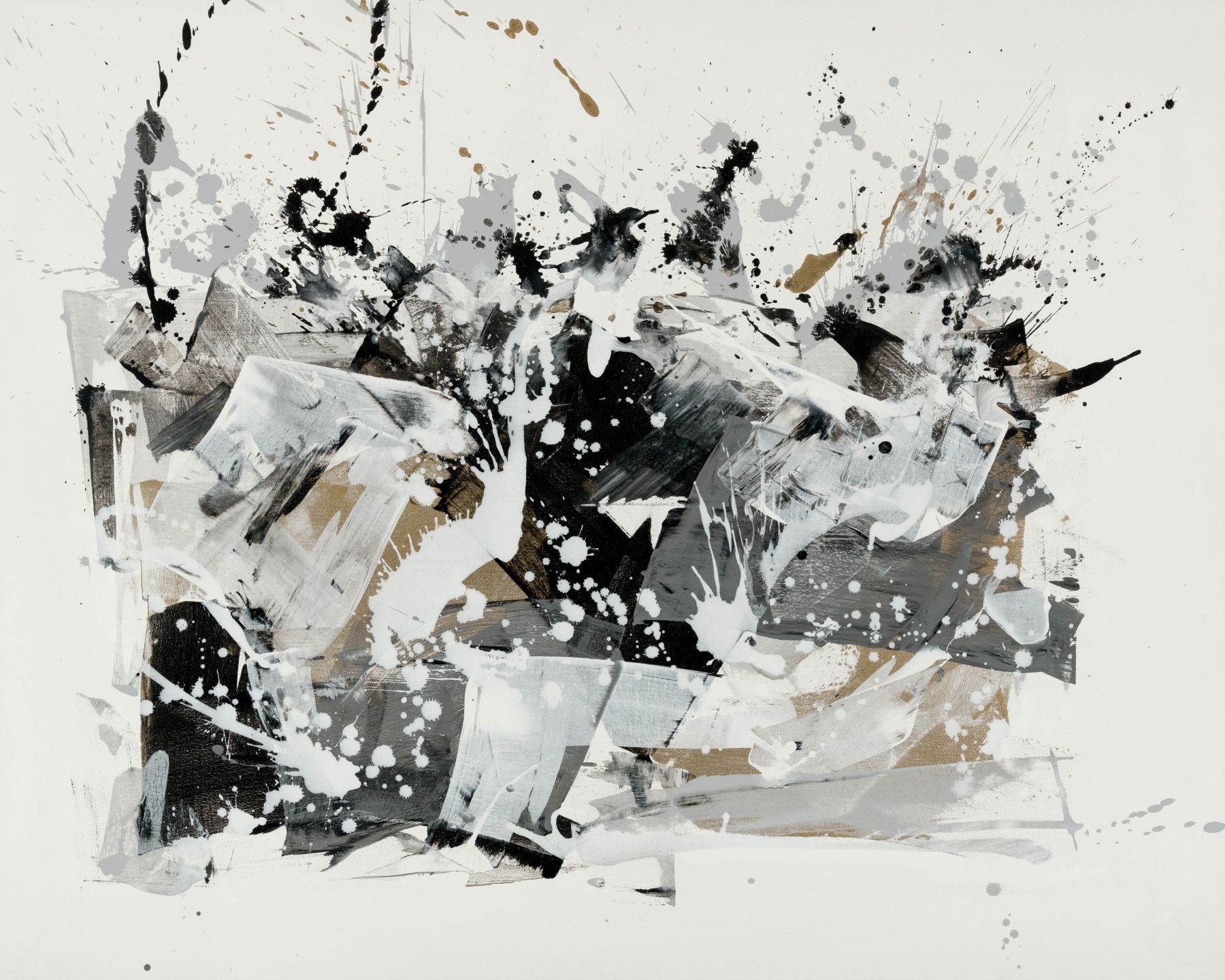 Beautiful white abstract painting featuring a central splash of gold tone, grey and black.