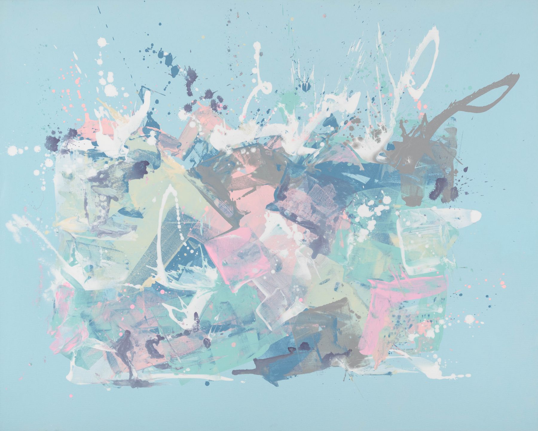 Beautiful light aqua abstract painting featuring a central splash of pink, green, yellow, grey, blue and white.