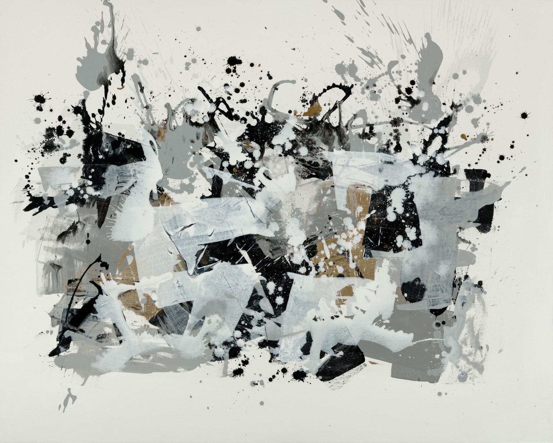 Beautiful white abstract painting featuring a central splash of gold tone, grey and black.