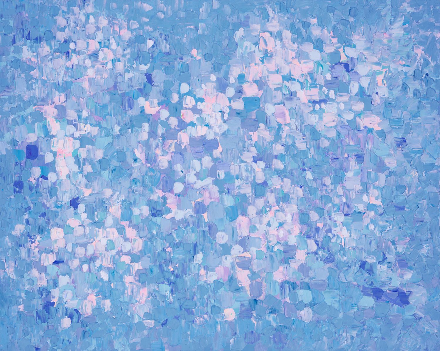 Beautiful bright multicoloured abstract print featuring blue, pink, mauve and white colour fusion design.