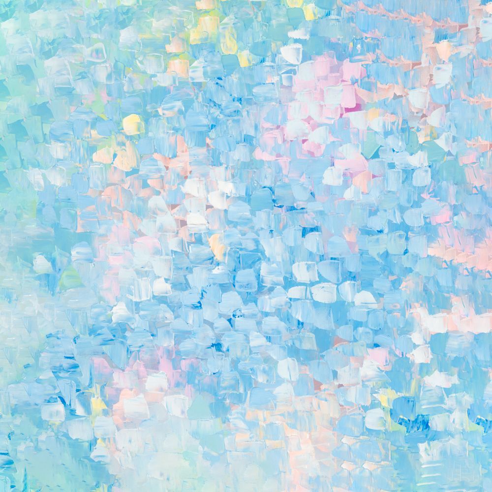 Beautiful bright multicoloured abstract print featuring mint, pink, blue, grey and white colour fusion design.