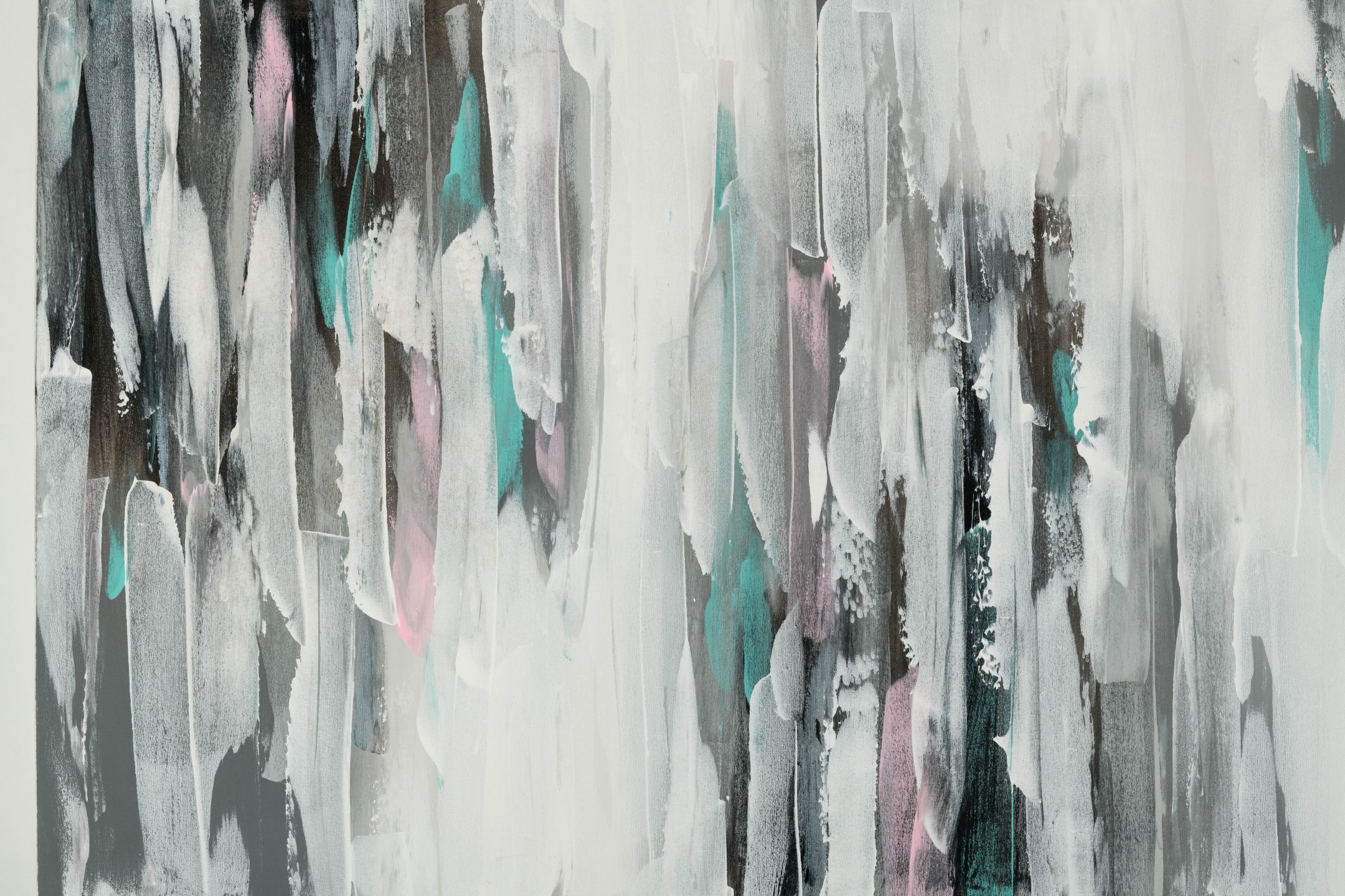 Beautiful pastel abstract print featuring aqua, pink grey and white.