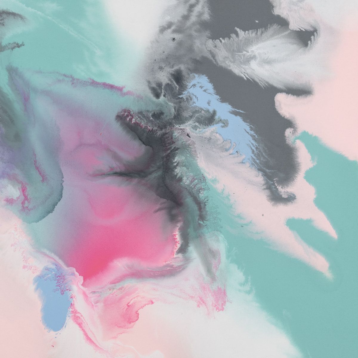 Beautiful bright multicoloured abstract print featuring blue, pink, green, grey and white colour fusion design.