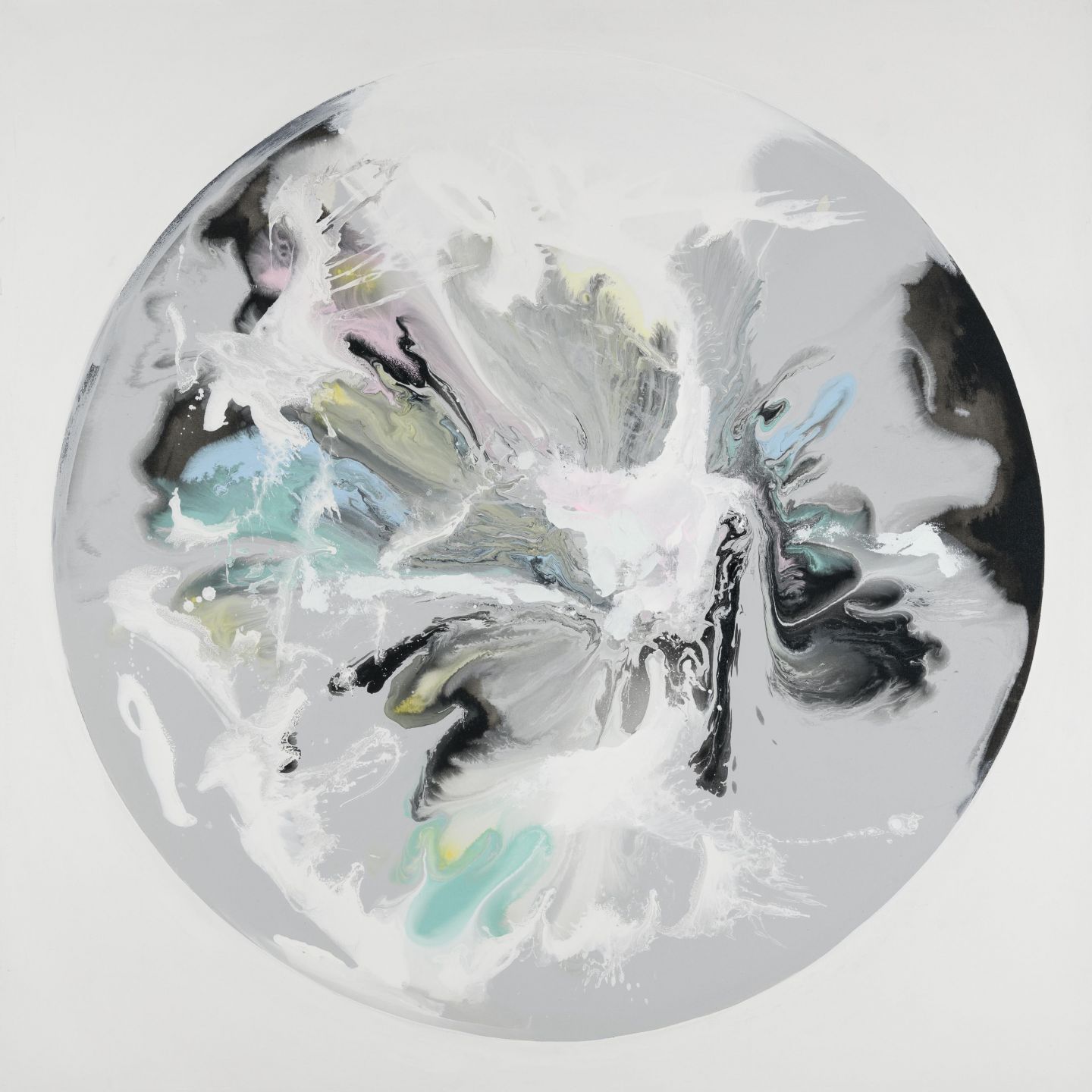Beautiful round design abstract print in pink, blue, yellow, grey and black on a white background.