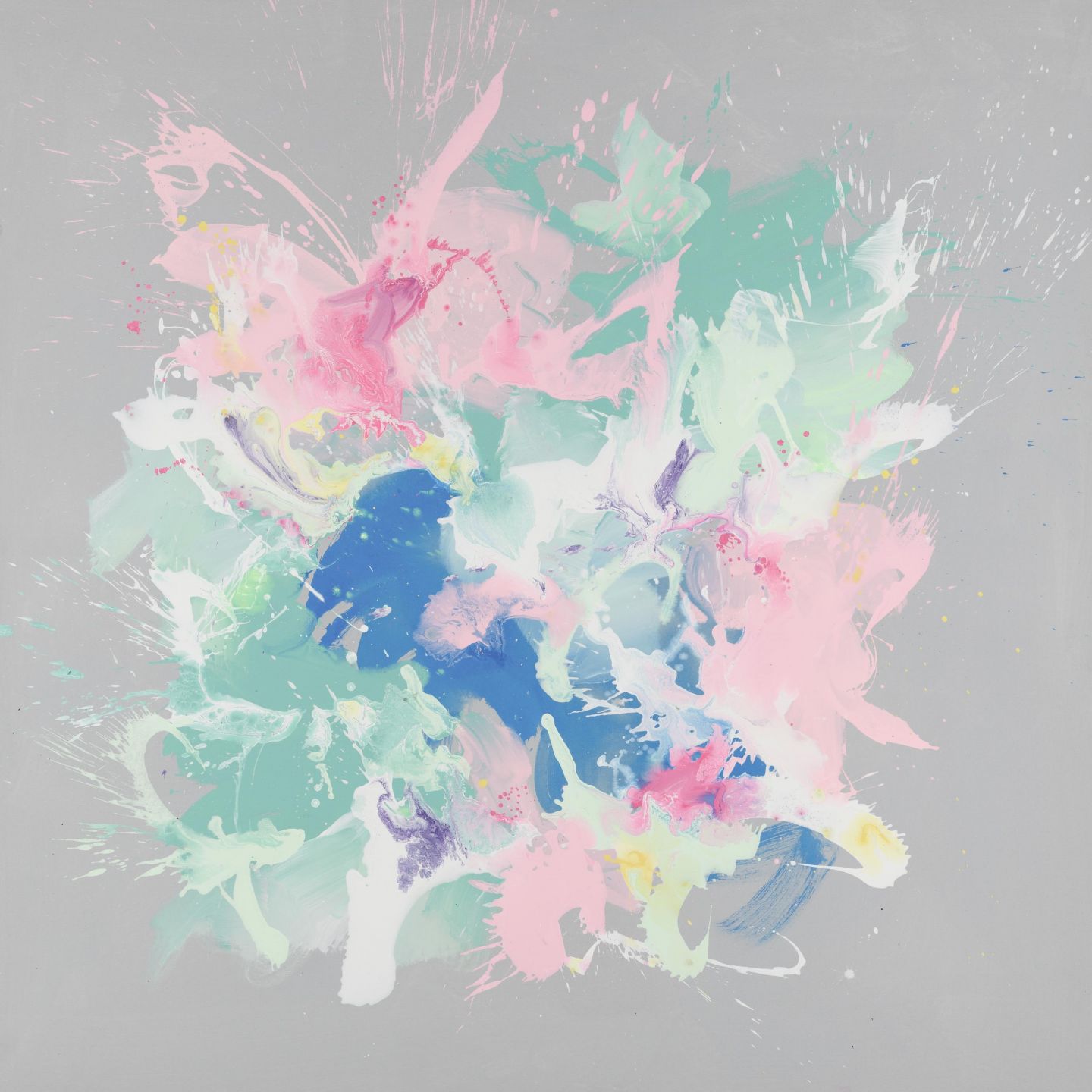 Beautiful grey abstract print featuring a central splash of aqua, mint, baby blue, baby pink, bright pink, and white.