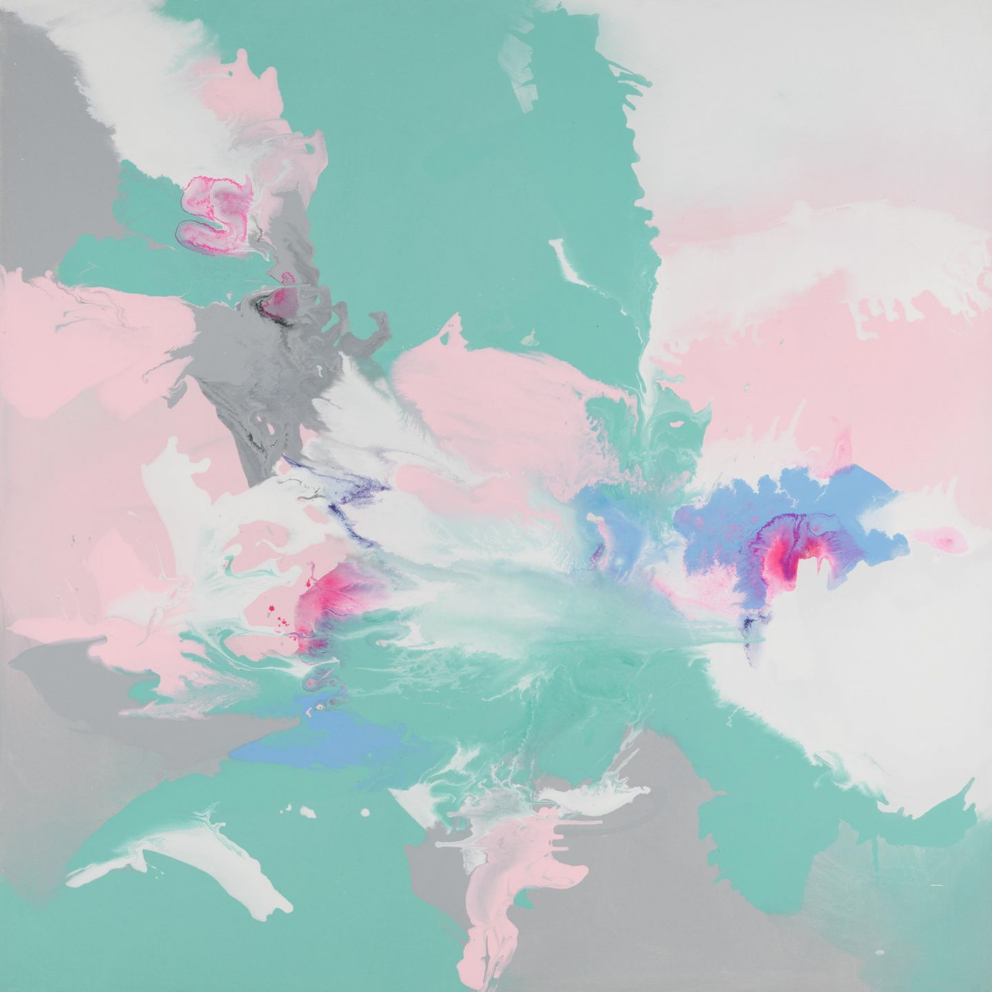 Beautiful pastel multicoloured abstract print featuring aqua, pale pink, bright pink, blue, grey and white.