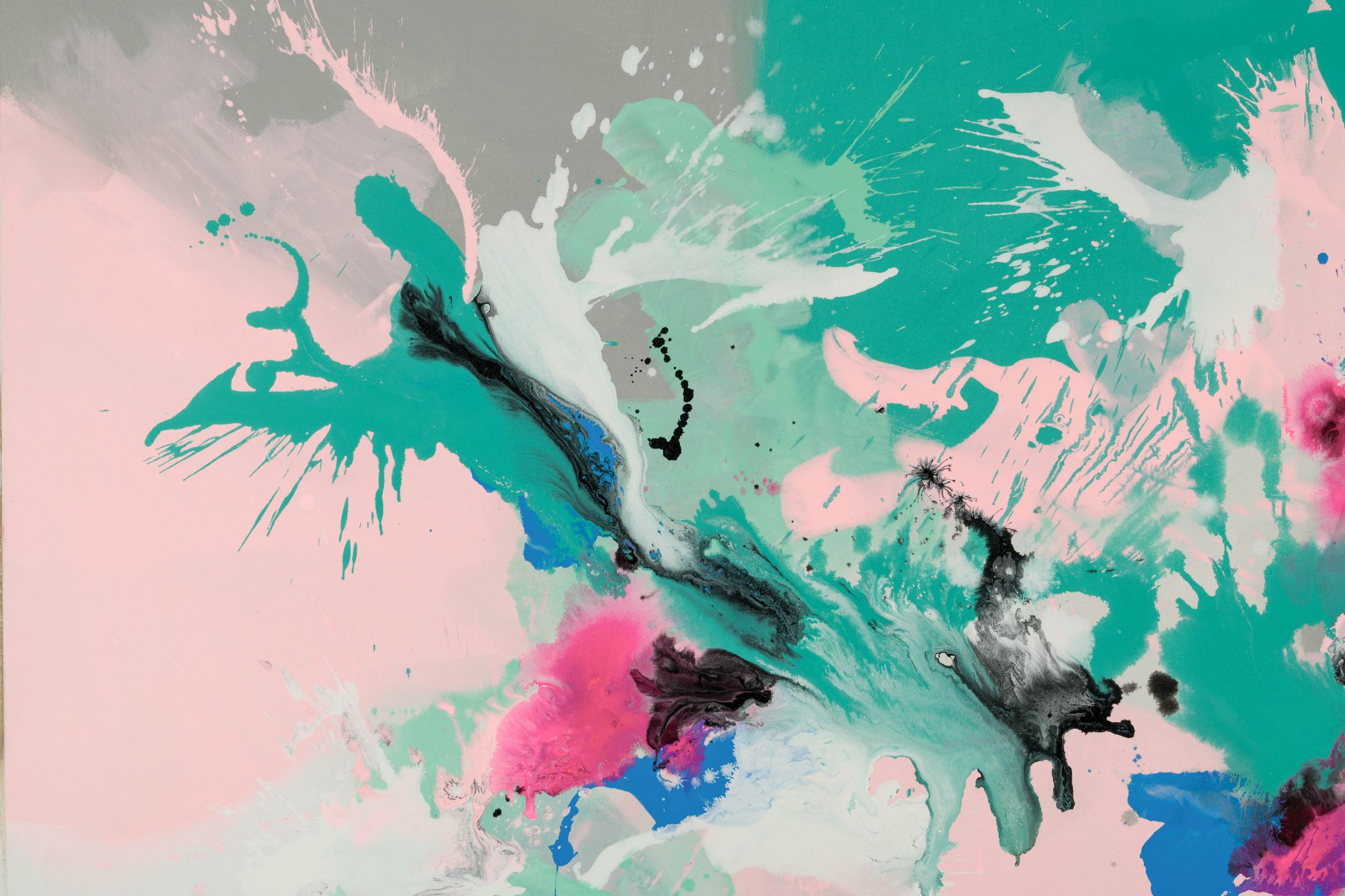 Beautiful bright multicoloured abstract print featuring , pink, green, grey and white colour fusion design.