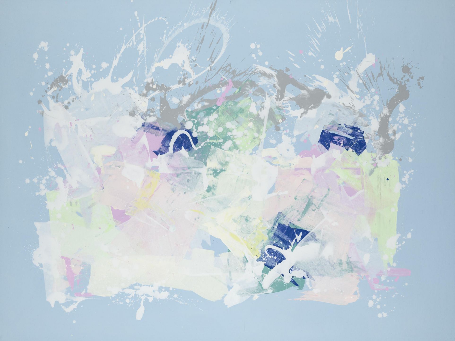 Beautiful light aqua abstract painting featuring a central splash of pink, green, yellow, grey, blue and white.
