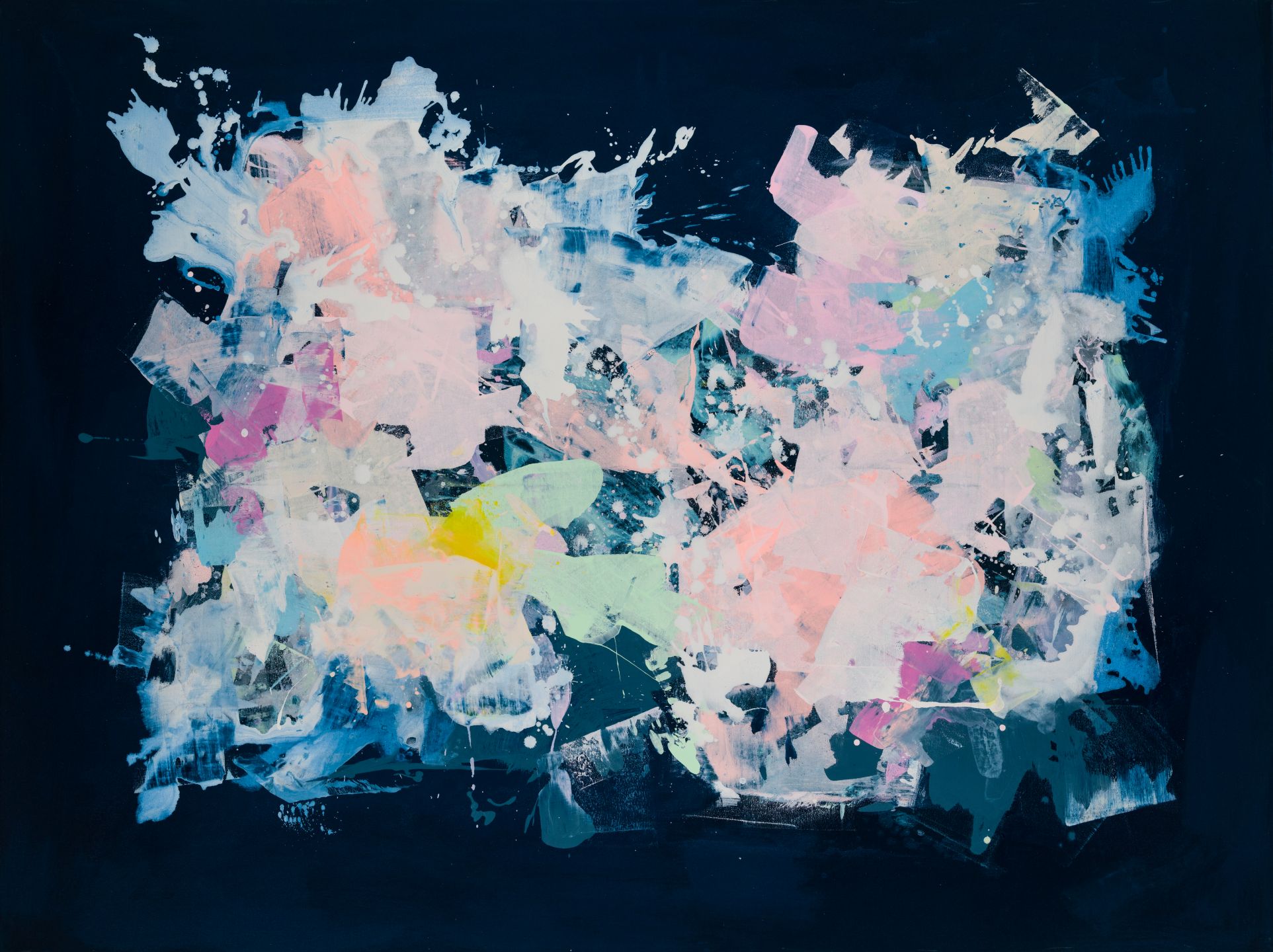 Beautiful abstract print featuring a central splash of pink, lilac, aqua, blue and white.