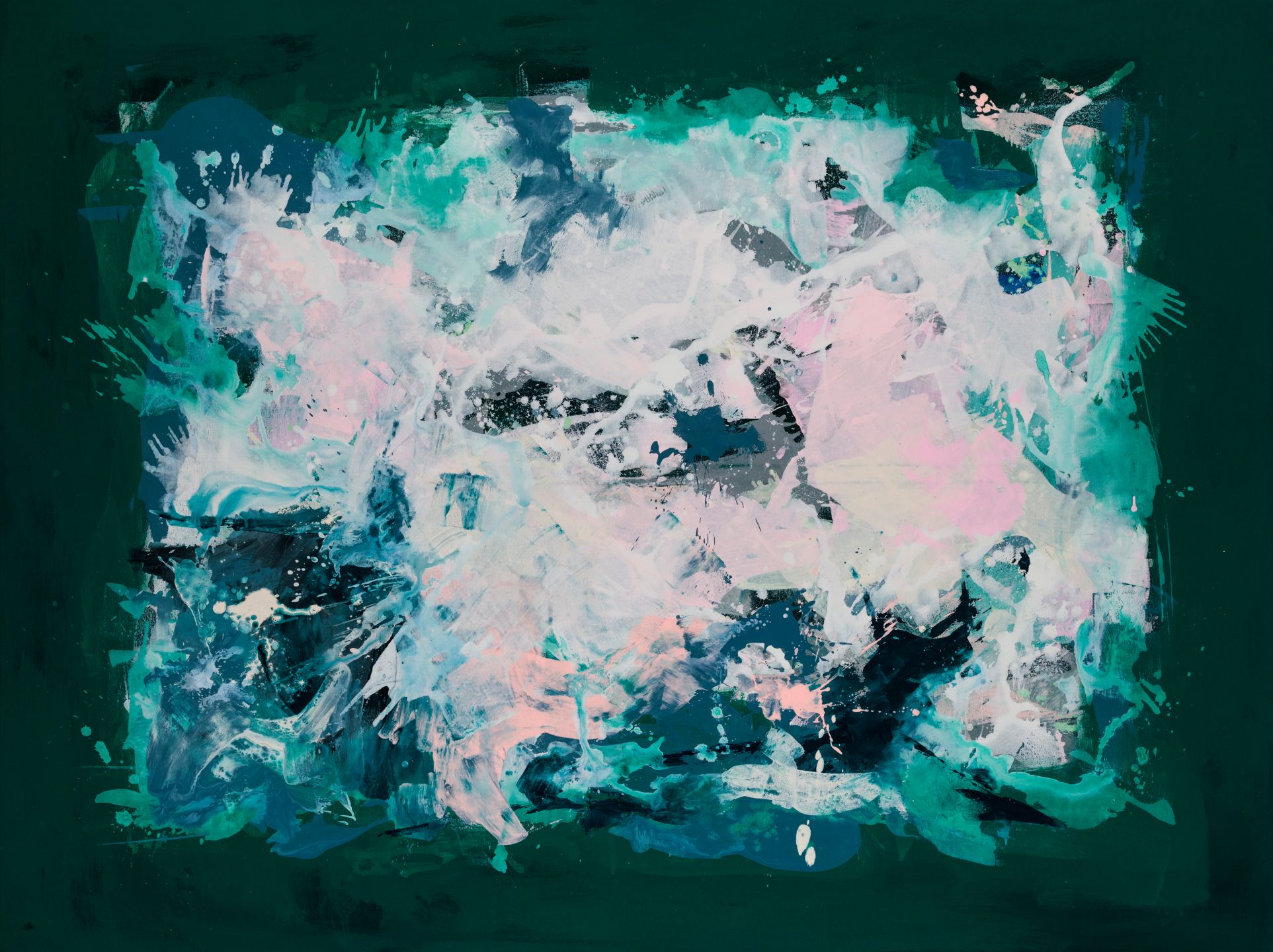 Beautiful abstract print featuring a central splash of pink, lilac, aqua, blue and white.