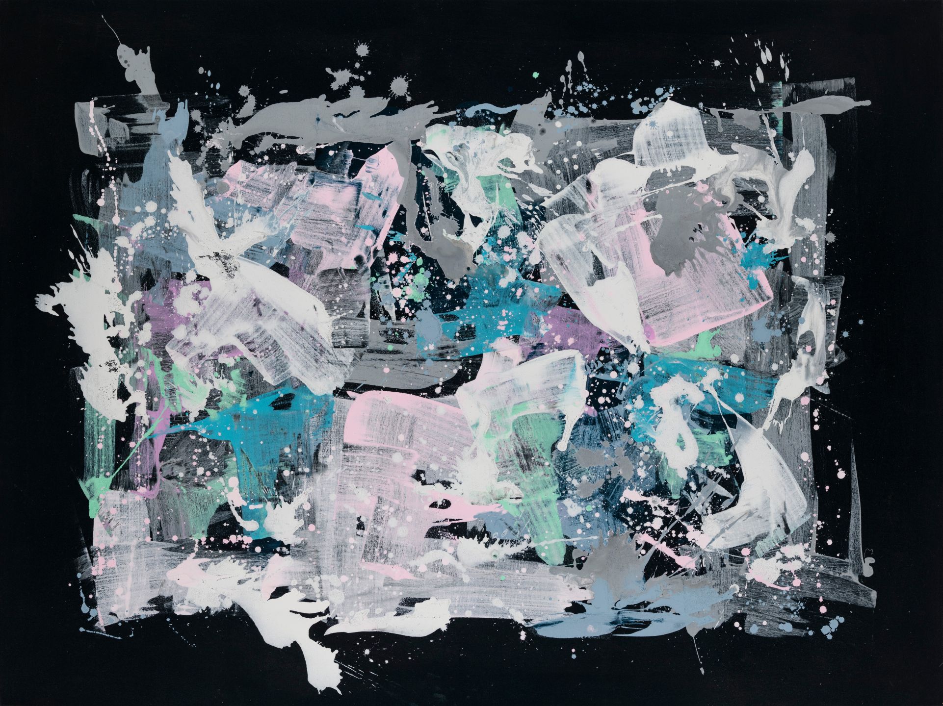 Beautiful abstract print featuring a central splash of pink, lilac, aqua, blue and white.