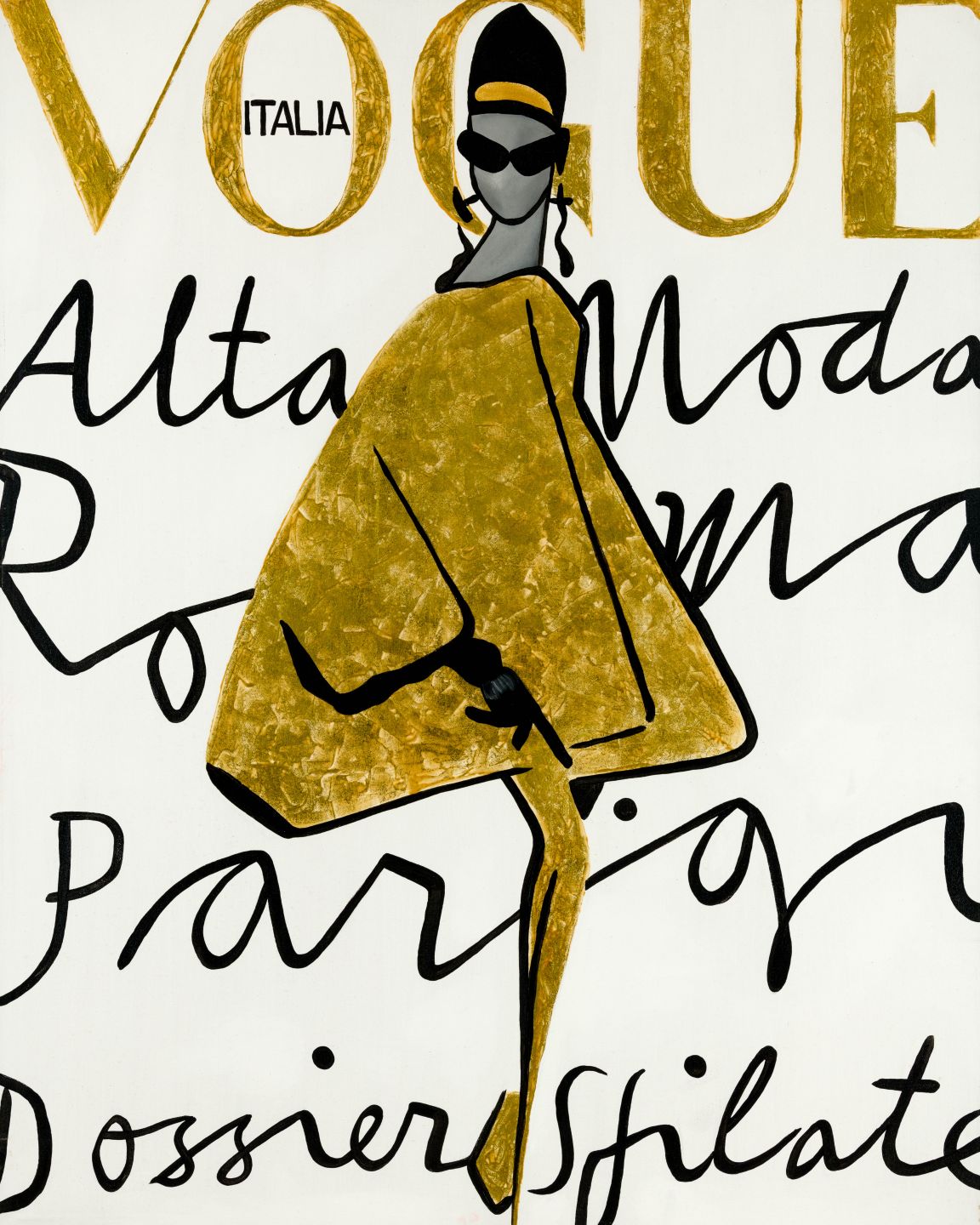 • This is a beautiful print of our Vogue painting. It is the front cover of a Vogue Italia from the 1960's. Grey textured background with black writing and highlights of a gold tone.