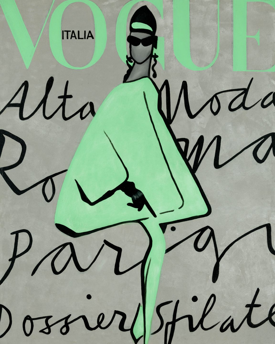 • This is a beautiful print of our Vogue painting. It is the front cover of a Vogue Italia from the 1960's. Grey textured background with black writing and highlights of green.