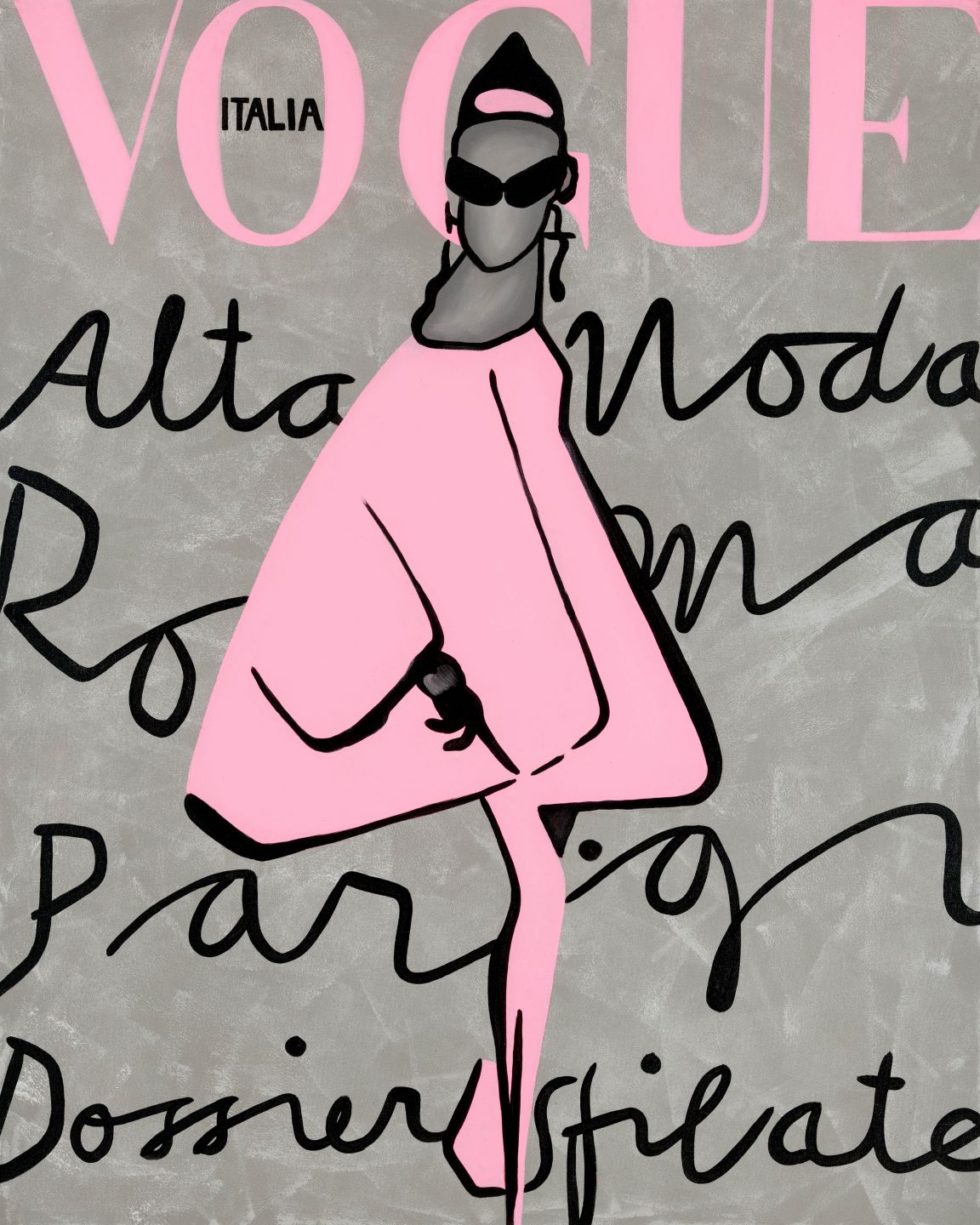 • This is a beautiful print of our Vogue painting. It is the front cover of a Vogue Italia from the 1960's. Grey textured background with black writing and highlights of pale pink.