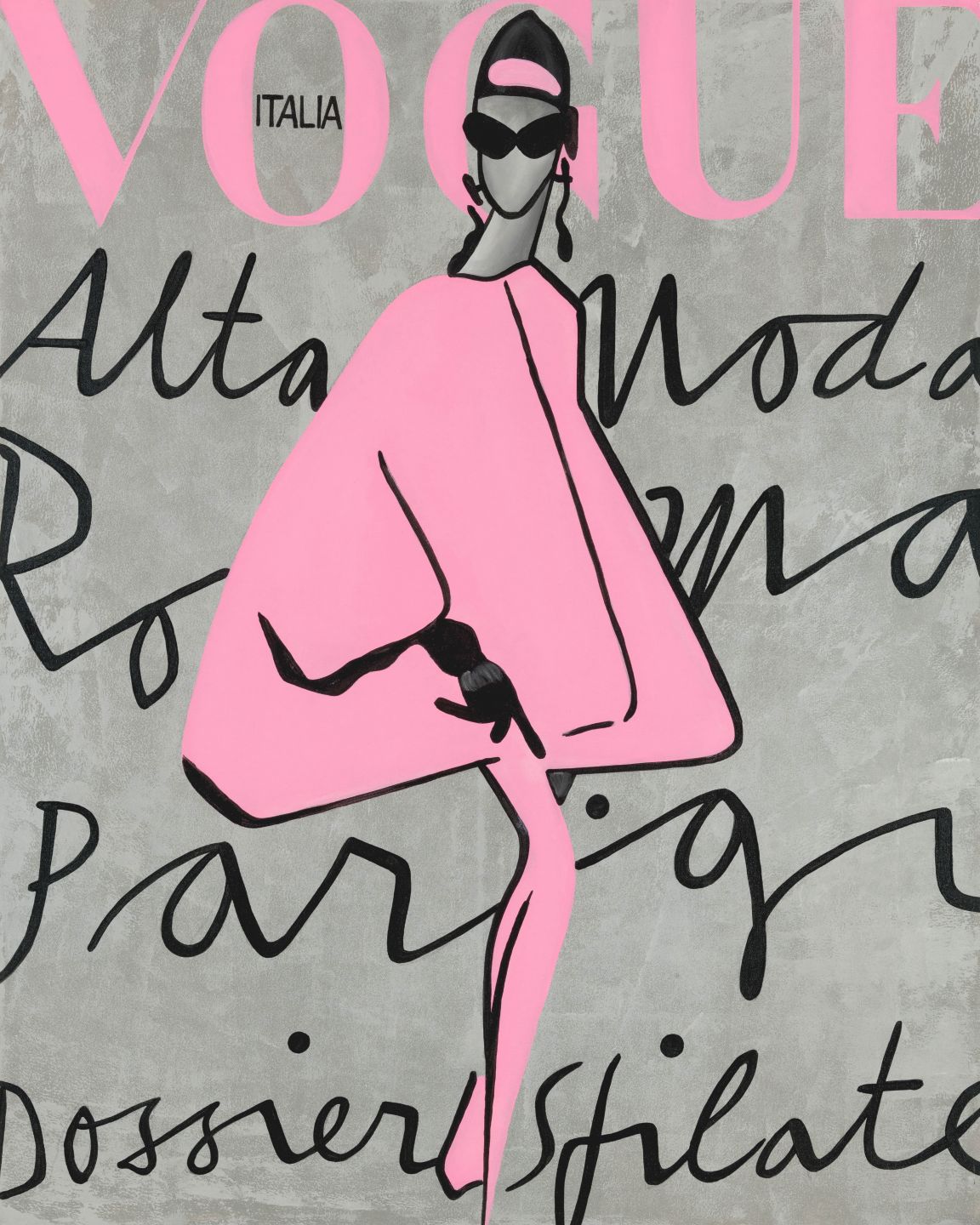 • This is a beautiful print of our Vogue painting. It is the front cover of a Vogue Italia from the 1960's. Grey textured background with black writing and highlights of pink.